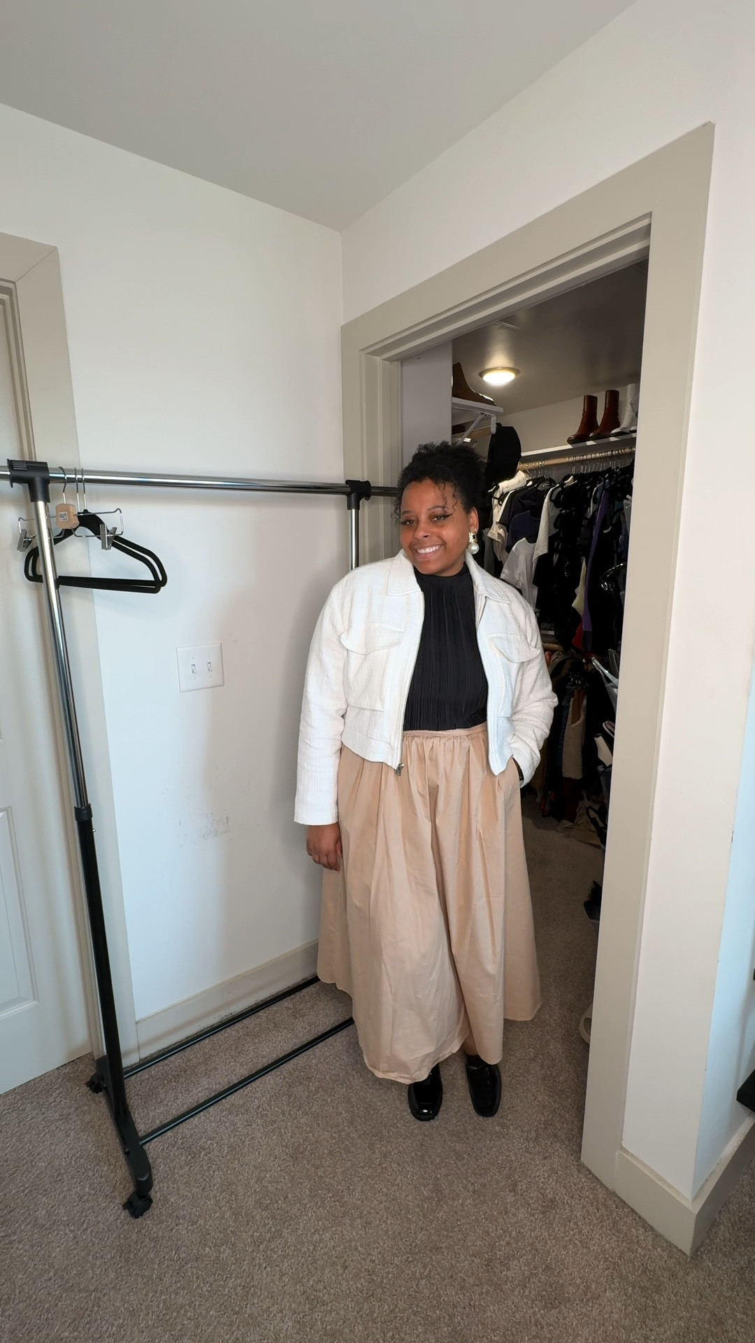 All black “suit” with Good American blazer, Oak+Fort tailored skirt paired with a script Reformation tank and cow print flats for a pop of interest. Continuing to tailor the fit with a simple gold and black belt and finished with pearl teardrop earrings from Anthropologie.