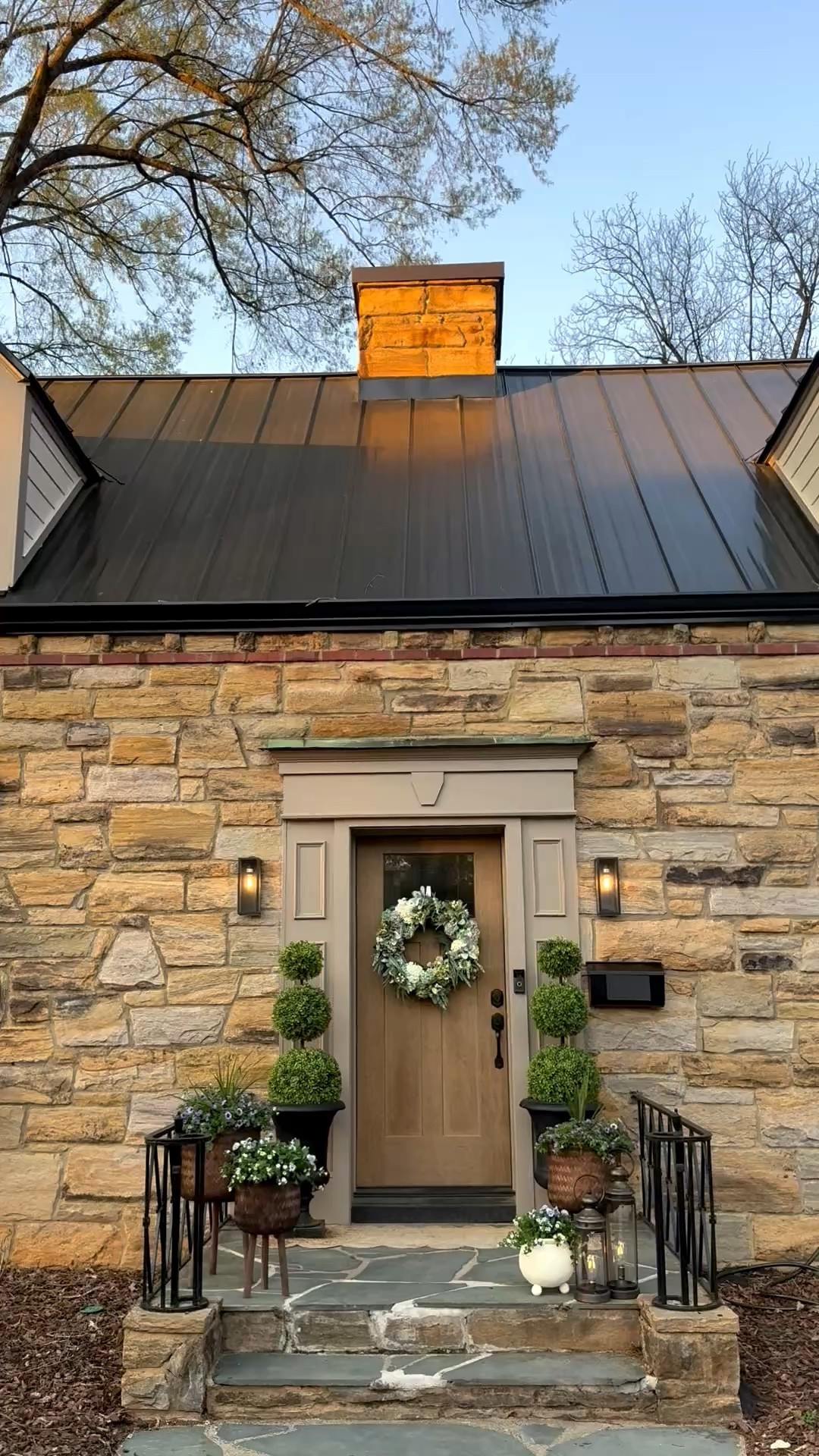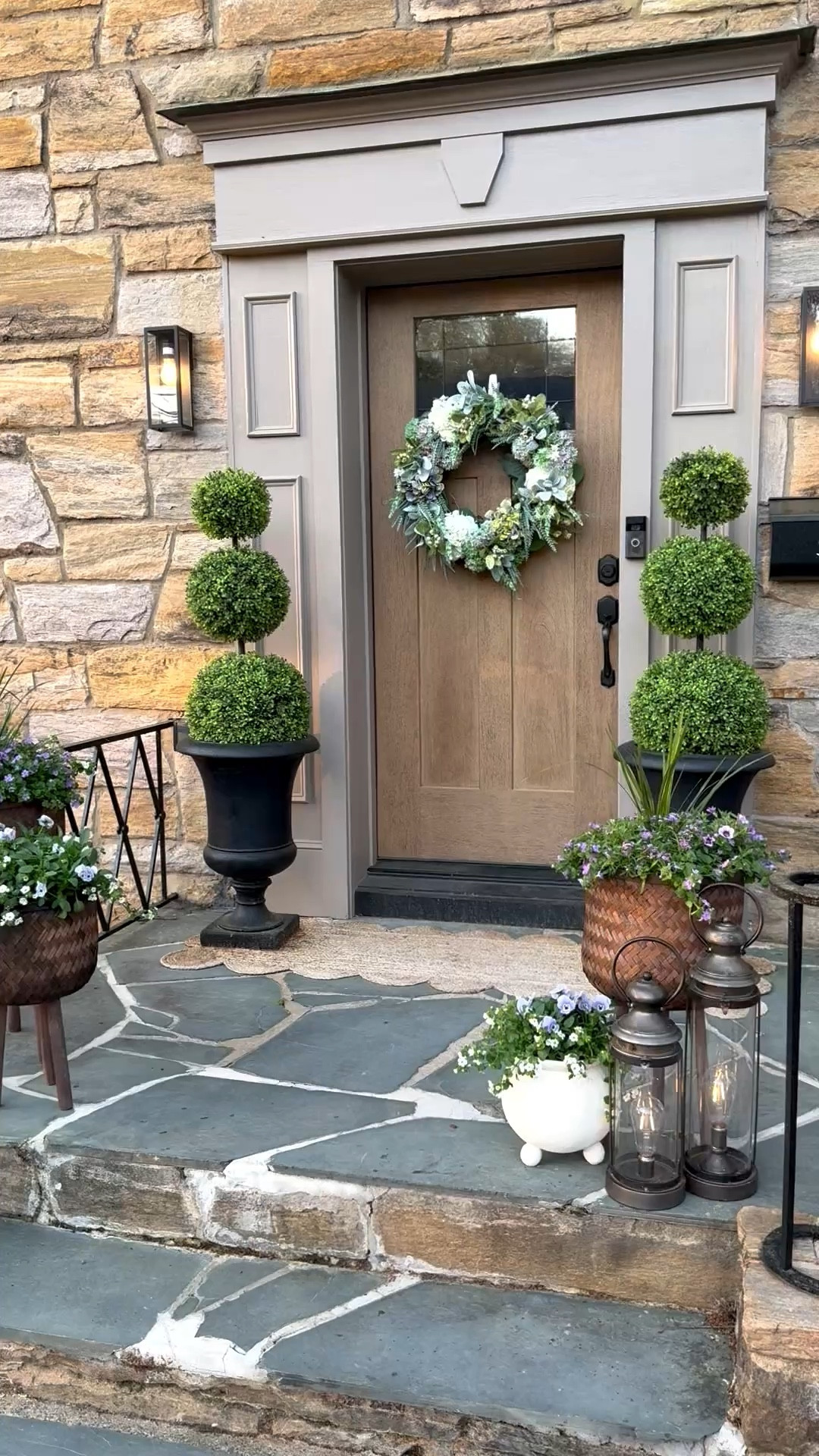 It always feels so dreary once I take down our Christmas garlands and wreaths from our front porch area so I loved cheering it up with some adjustable topiaries and this beautiful spring wreath from @wayfair. The scalloped rug is a #wayfair find too! #ad #wayfairpartner #spring