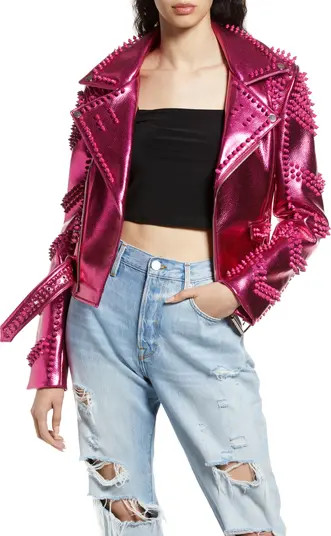 AZALEA WANG Spike Metallic Belted Faux Leather Moto Jacket | Nordstrom