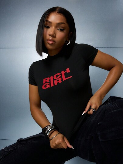 SUMWON WOMEN Rich Girl Slogan Graphic Baby Tee Crop Top Short Sleeve Fitted Summer Festival Stree...