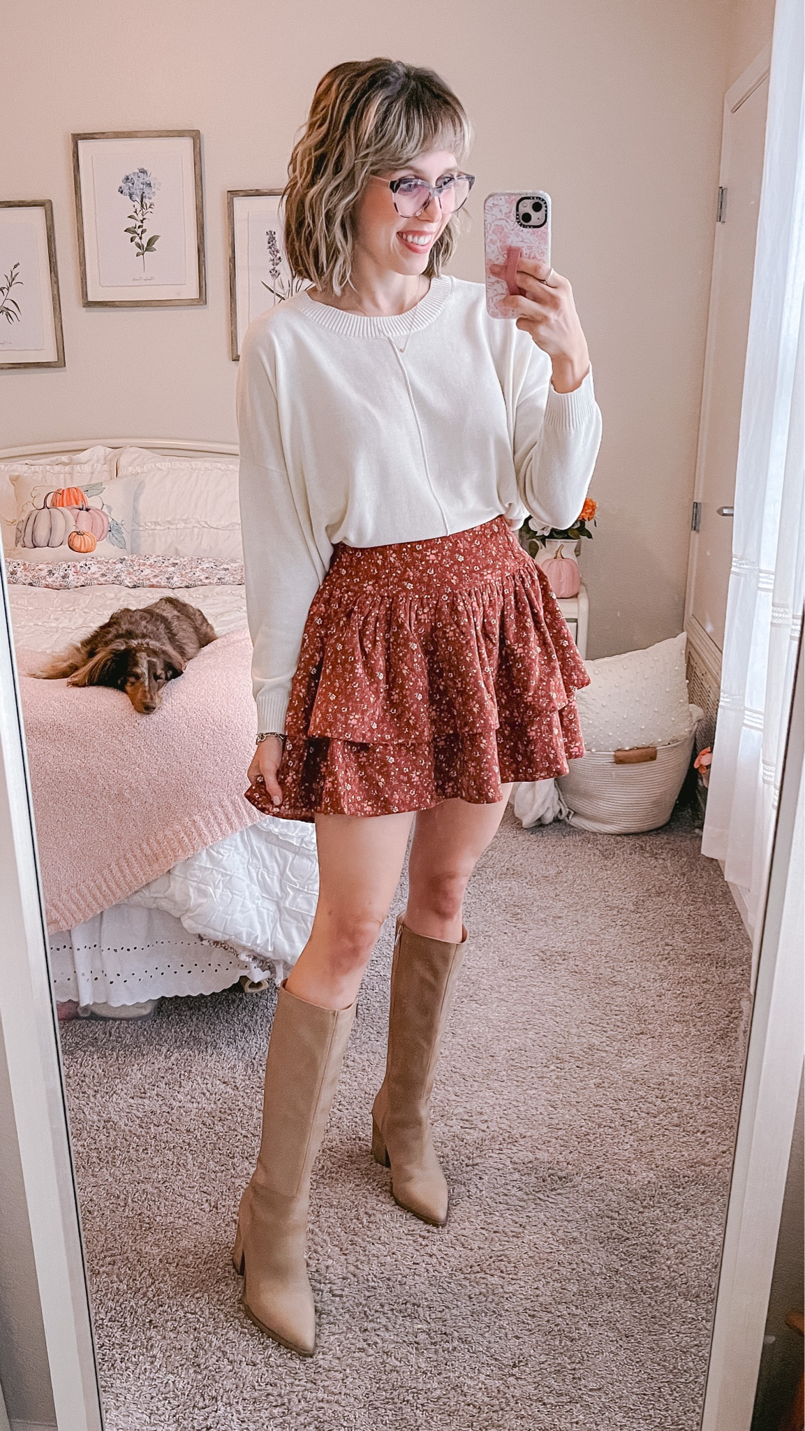 Pink Frye boots, pink Frye boots outfit, pink Frye campus boots, LoveShackFancy floral dress, fall floral dress, girly fall outfit