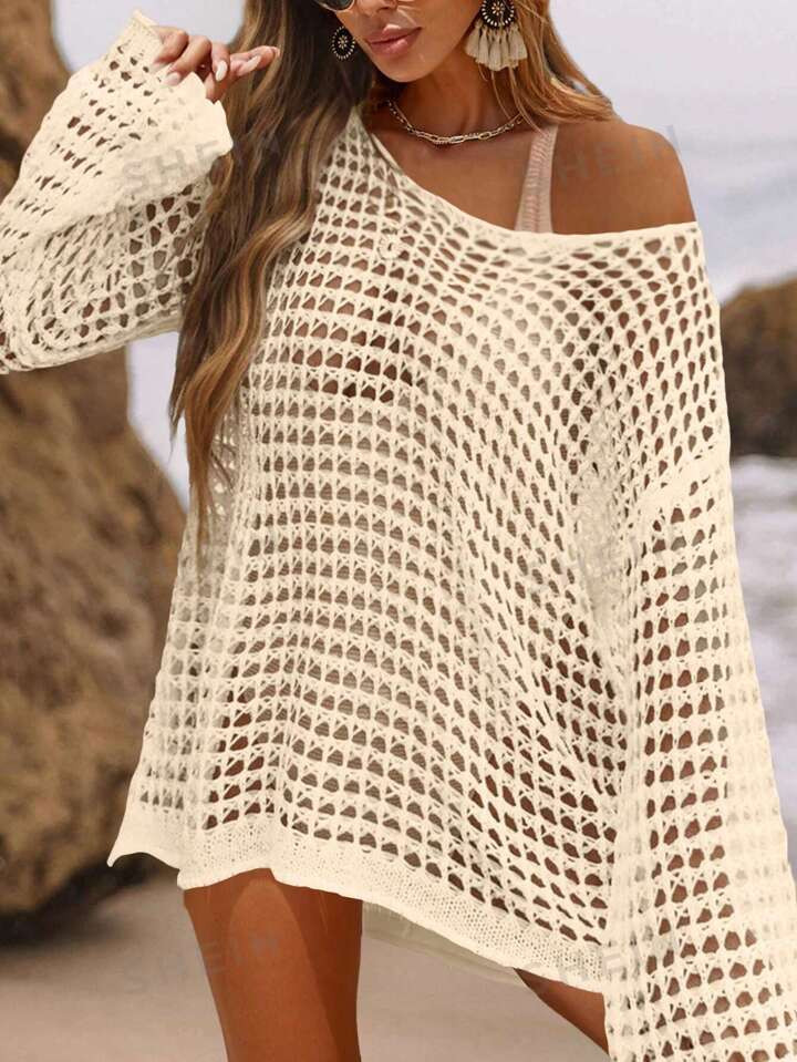 SHEIN VCAY Holiday Beach Leisure Loose Knitted Swimsuit Cover-Up With Hollow-Out Design