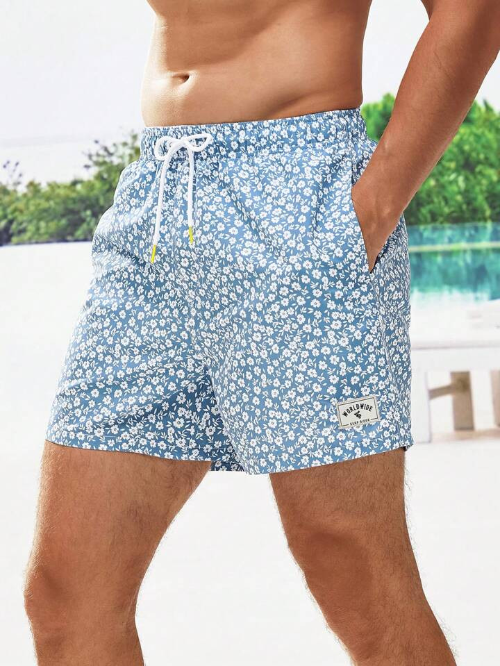 Manfinity Swimmode Men Ditsy Floral Print Letter Patched Detail Drawstring Waist Swim Trunks | SH...