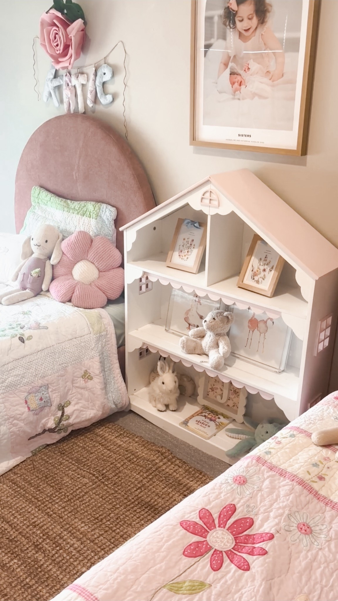 Their room has been a work in progress but I am loving the direction it’s going in and so are they! Pops of soft color, flowers, stuffies and encouraging sister bonding 🌸