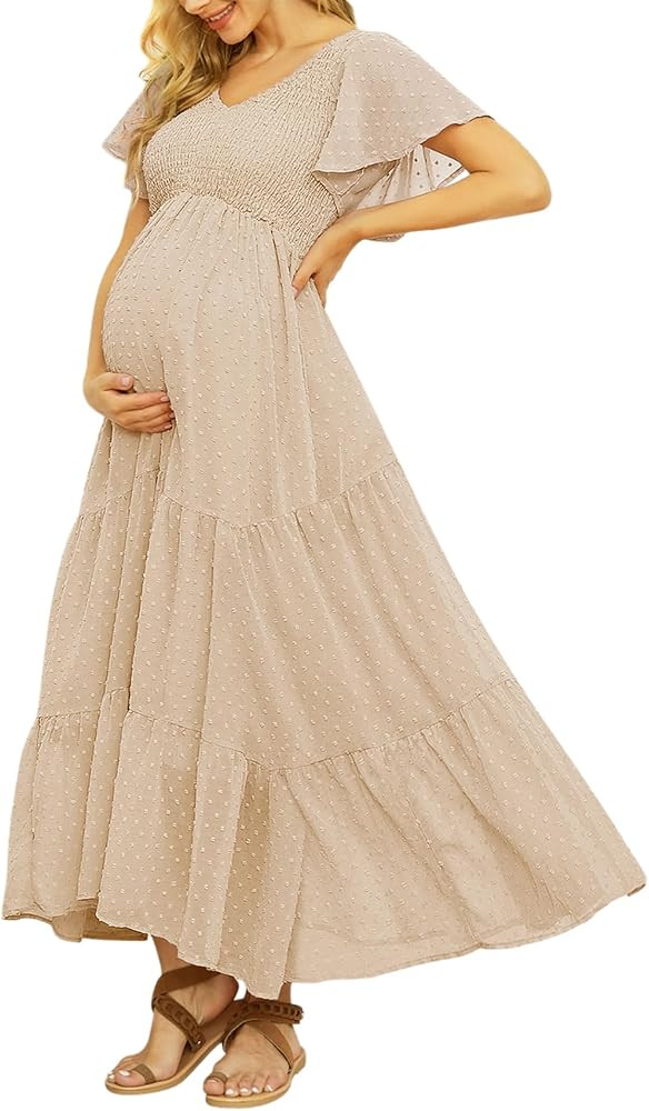 Swiss Dot Smocked Maternity Dress for Baby Shower Photoshoot Casual V Neck Ruffle Sleeve Empire W...
