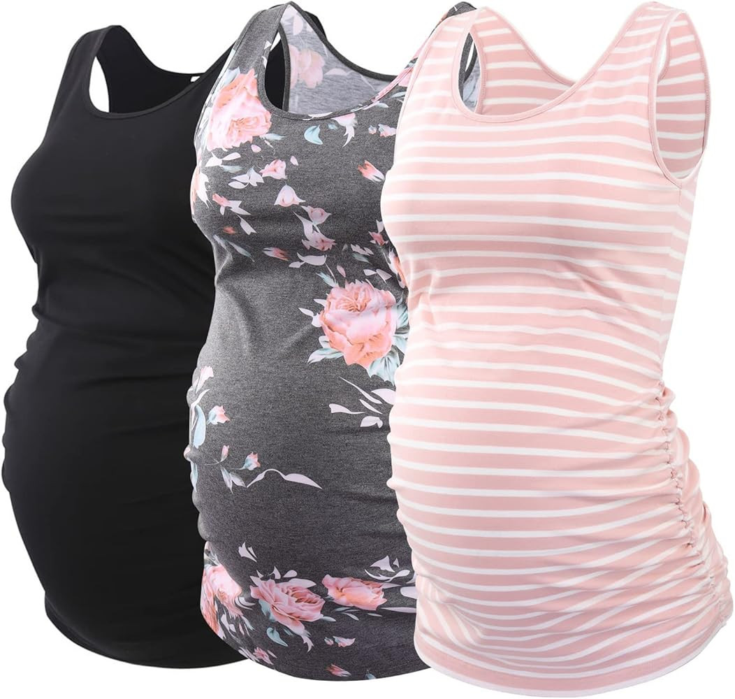 Ecavus 3PCS Womens Layering Maternity Tank Top Pregnancy Shirt Scoop Neck Sleeveless Ruched Vest