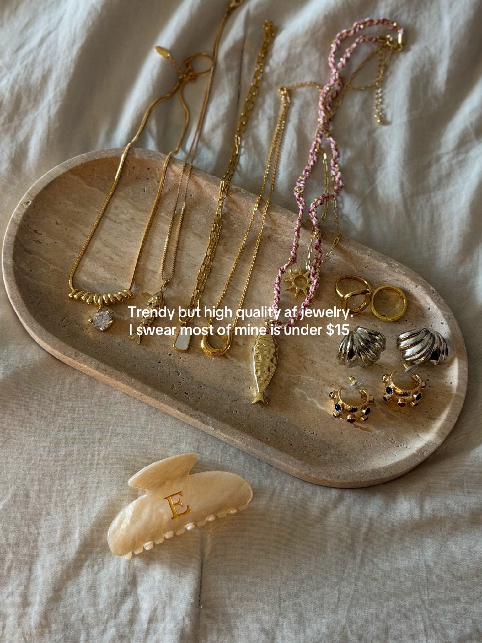 My everyday jewelry rotation — all from Amazon, all under $25. Gold necklaces I layer and never take off, simple rings, go-with-everything earrings, and the chunky colorful beaded necklaces that make any outfit look intentional. Every piece here earned its spot