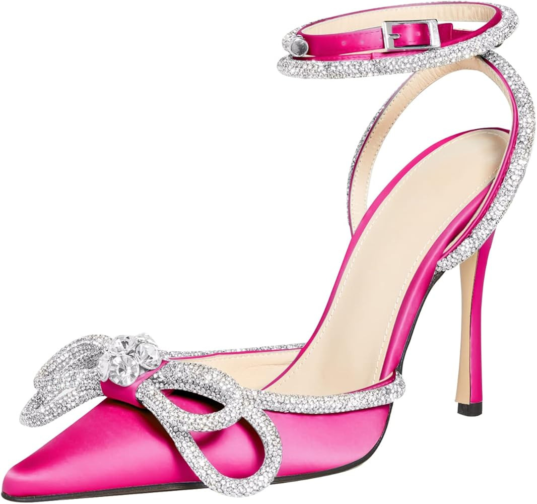 MIRAAZZURRA Women High Heeled Sandals Satin Sparkly Rhinestone Double Bow Sandals Pointy Toe Stil...