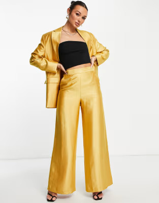ASOS DESIGN occasion satin wide leg suit pants in gold