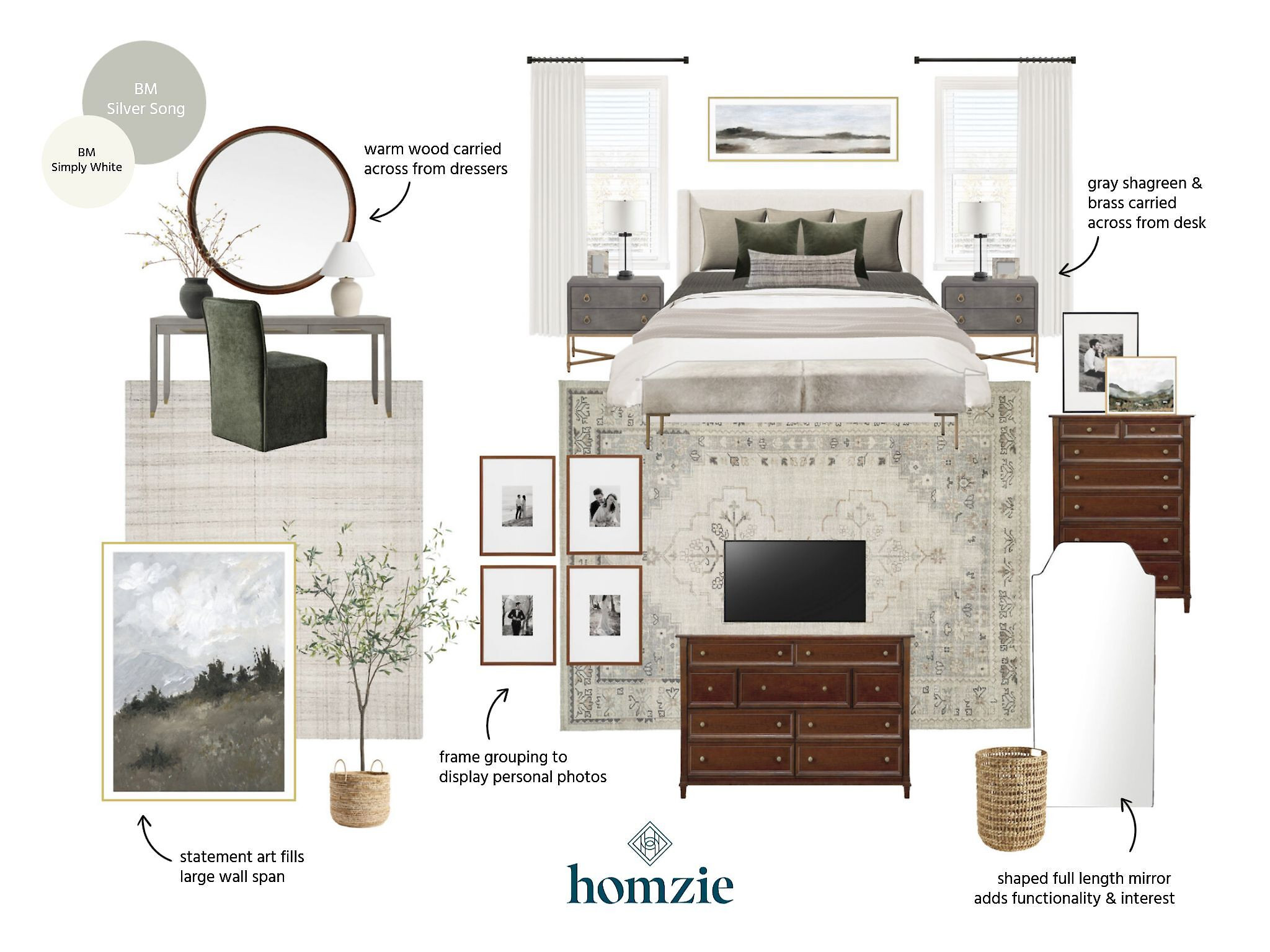 Master bedroom design featuring wood nightstands, rug, olive tree, curtains, rattan bench, wall art, lamps, decor, etc.#LTKFinds #LTKFavorites #HomeStyleDaily