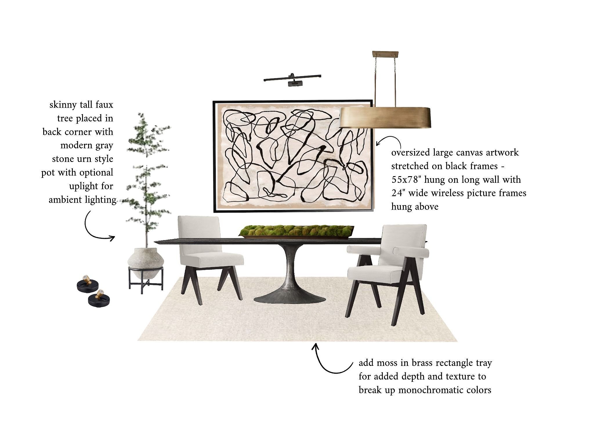 Contemporary dining room design featuring light fixtures, accent pillows, wall art, decor, etc.