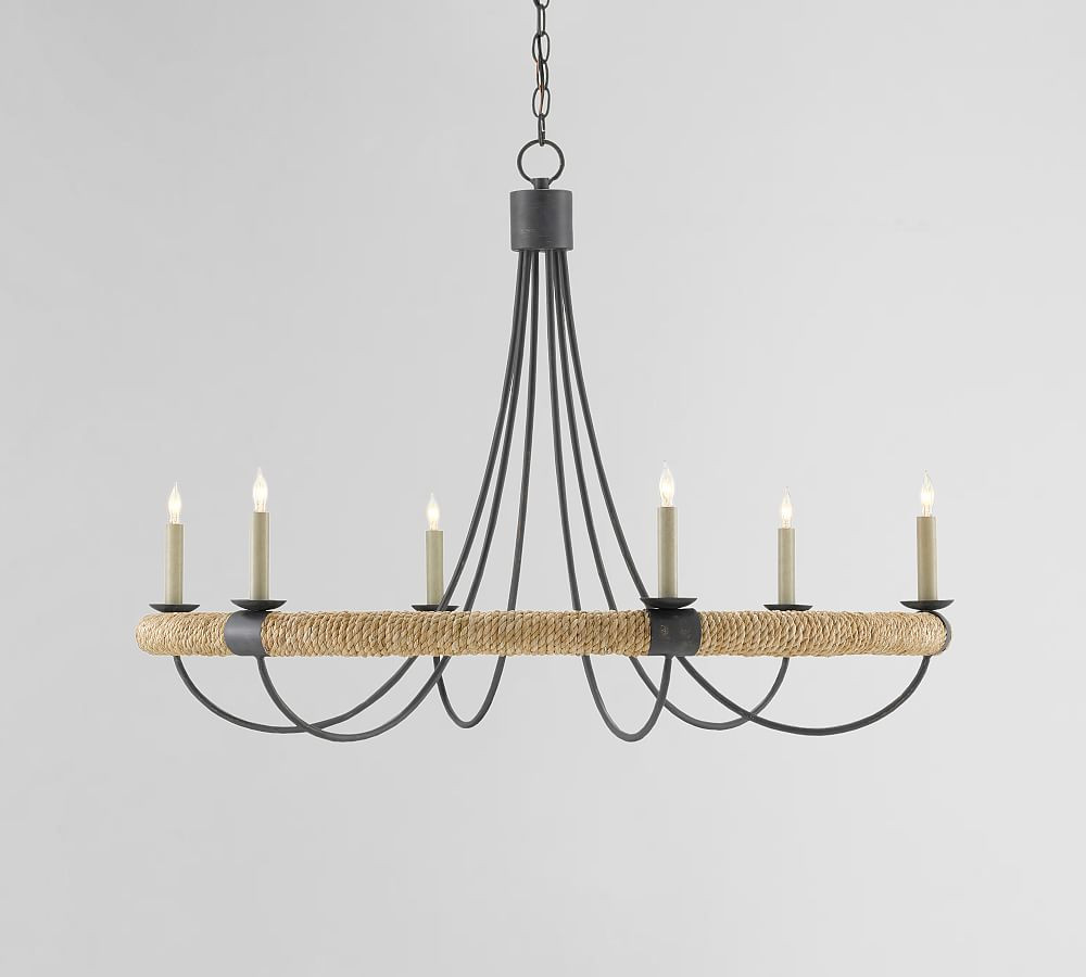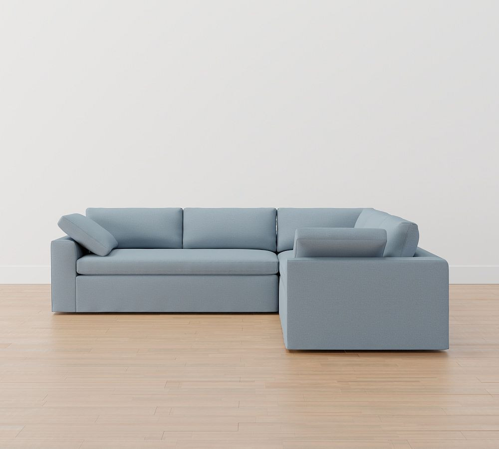 California coastal living room inspiration with navy sectional, wood coffee table, and accent chair