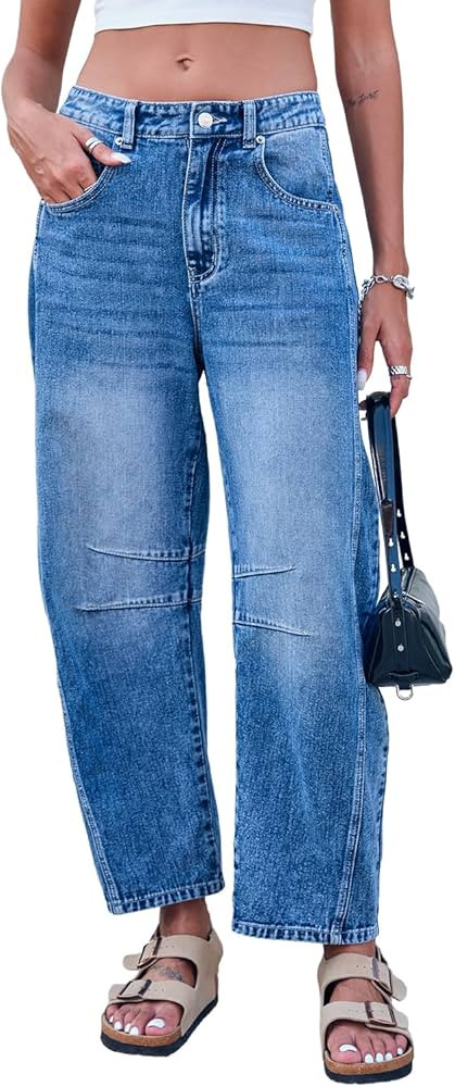 GREAIDEA Mid Rise Barrel Jeans for Women Wide Leg Mid Waist Cropped Denim Pants Y2k Baggy Boyfrie...