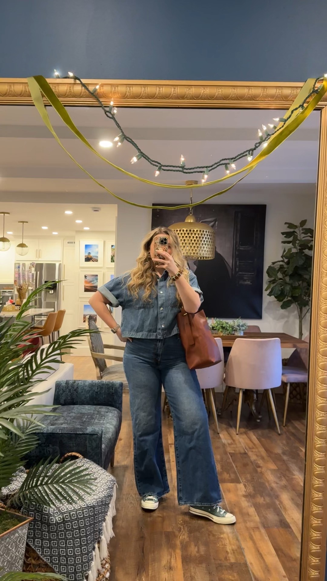 Spring outfits 2026. Obsessed with this funky Spring outfit! Madewell boxy airy denim short sleeve button up wearing a large for an oversized fit (currently on sale 25% off). Daze Denim Far Out High Waist Wide Leg Jeans in Zebra wearing a 31 but probably could've gotten a 30.