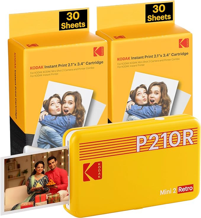 KODAK Mini 2 Retro 4PASS Portable Photo Printer (2.1x3.4 inches) + 68 Sheets Bundle, Yellow