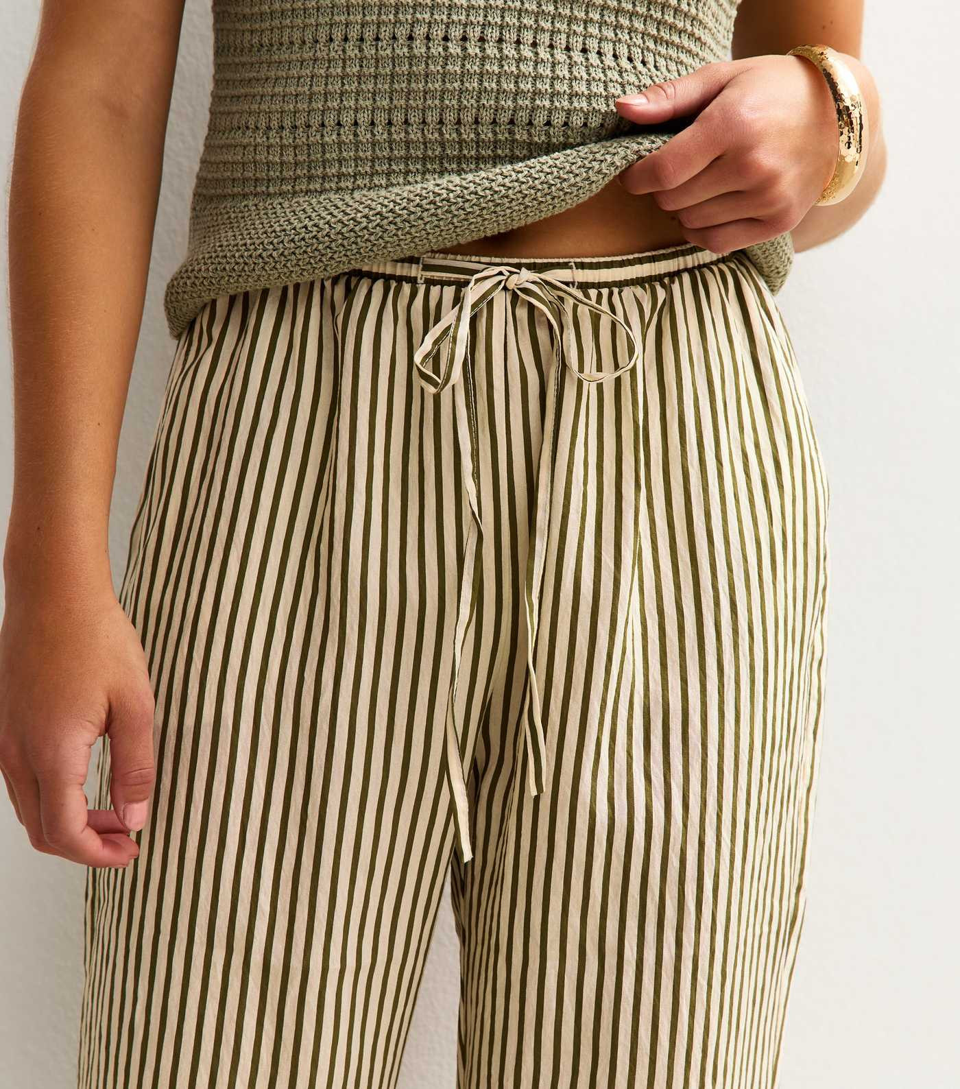 Petite Green Stripe Print Crinkle Texture Wide Leg Trousers | New Look