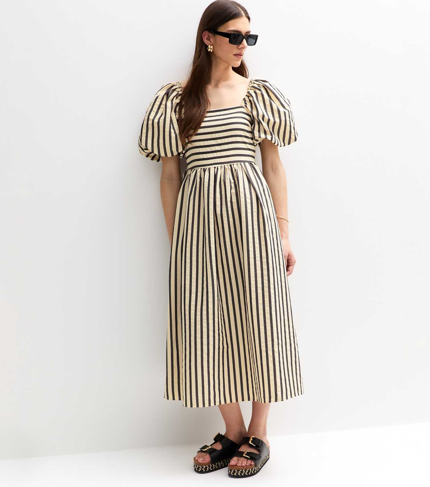 Cream Striped Puffed Sleeve Midi Dress | New Look