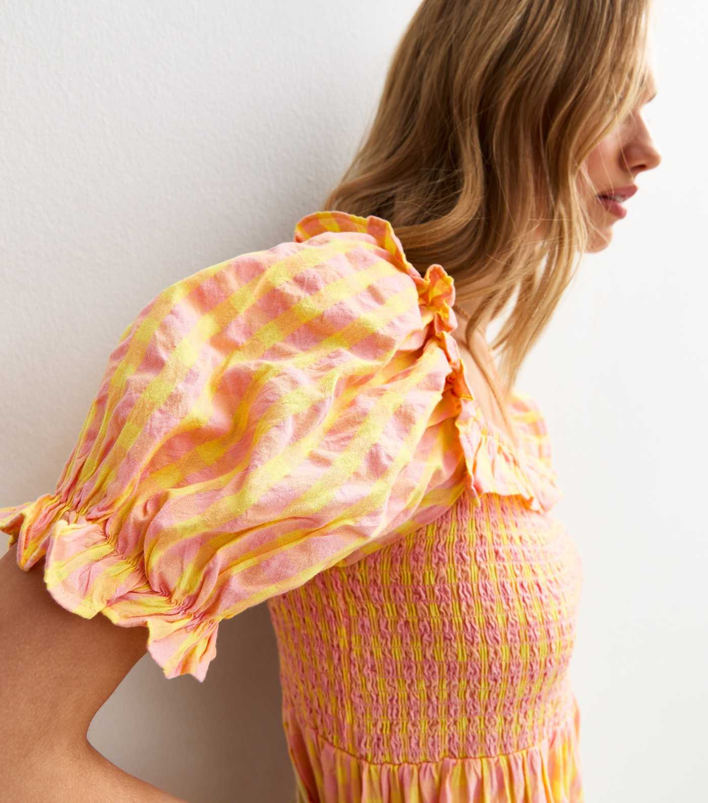 Pink Textured Gingham Smock Puff Sleeve Midi Dress | New Look
