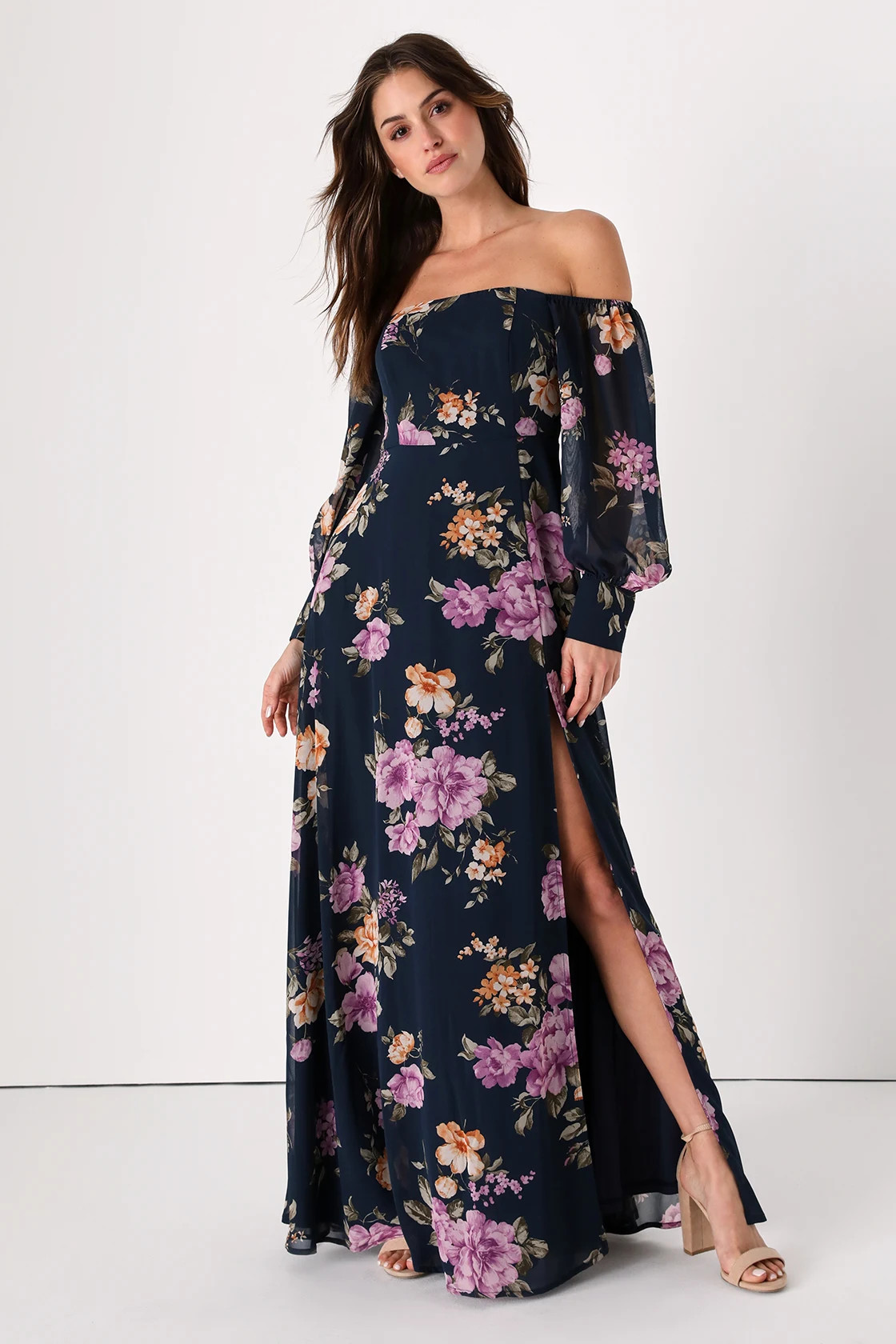 Feel the Romance Navy Blue Floral Off-the-Shoulder Maxi Dress
