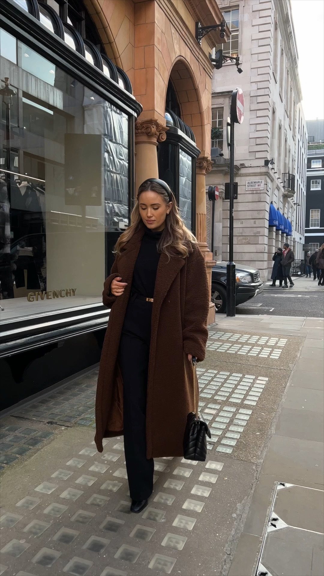 An elevated black-on-black look for winter days — one of my go-to combinations. Featuring a oversized, belted Holland Cooper coat, a cosy COS turtleneck, Commando leggings and my classic Dune boots, finished with a structured Strathberry bag for that refined touch.