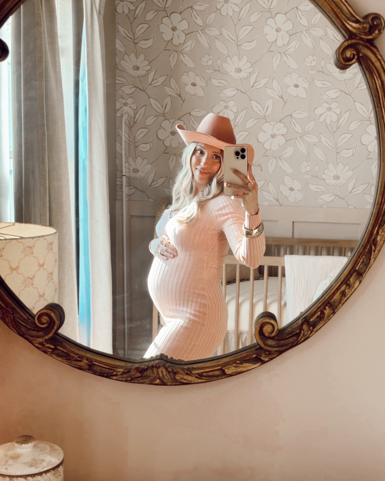 neutral maternity outfit, pregnancy loungewear, baby girl nursery, neutral nursery decor, floral wallpaper nursery