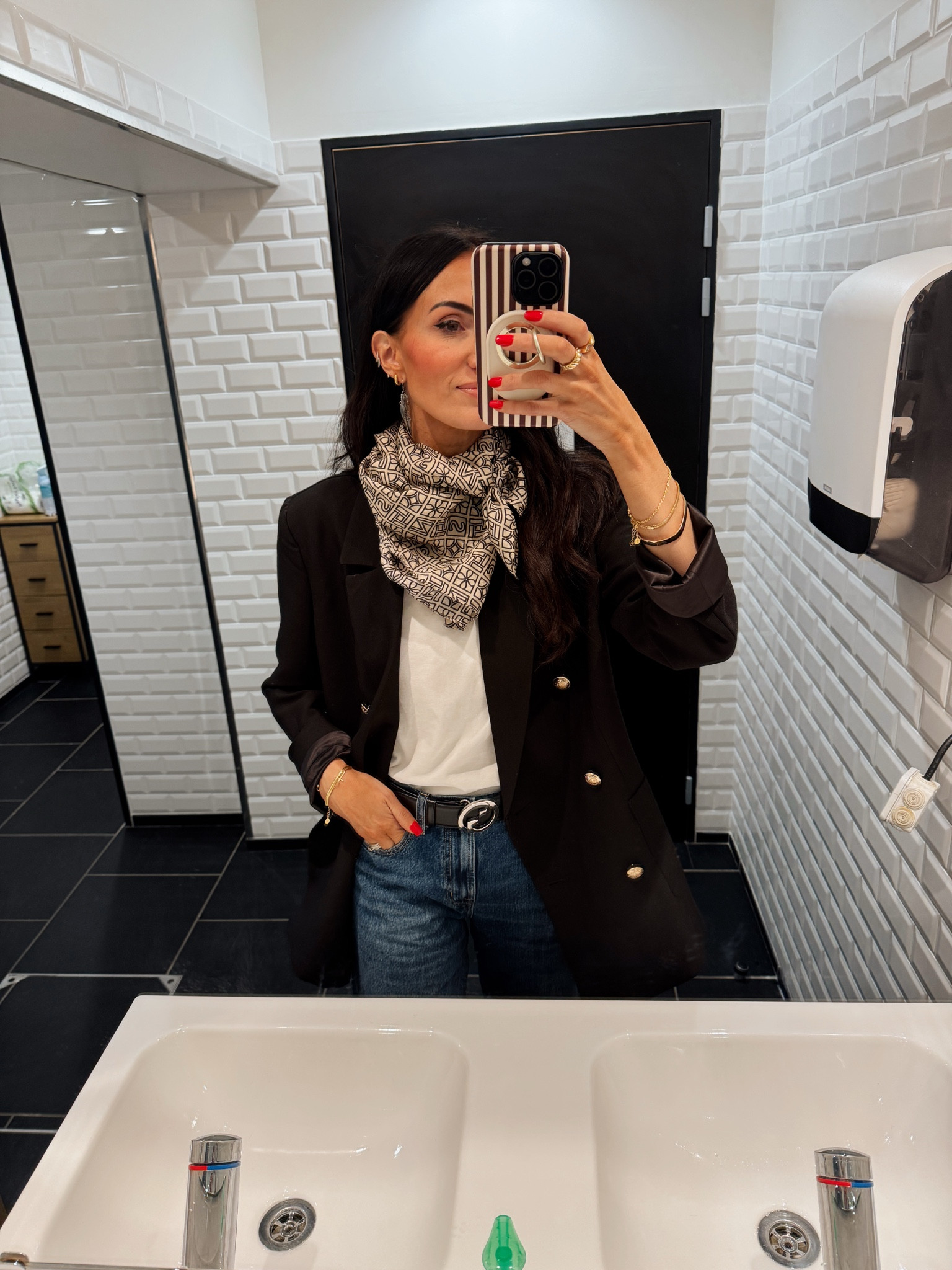 Easy outfit to repeat, linking similar striped shirt and same tank. Tank is tts. The jeans are also tts. $50. Earrings are 25% off.