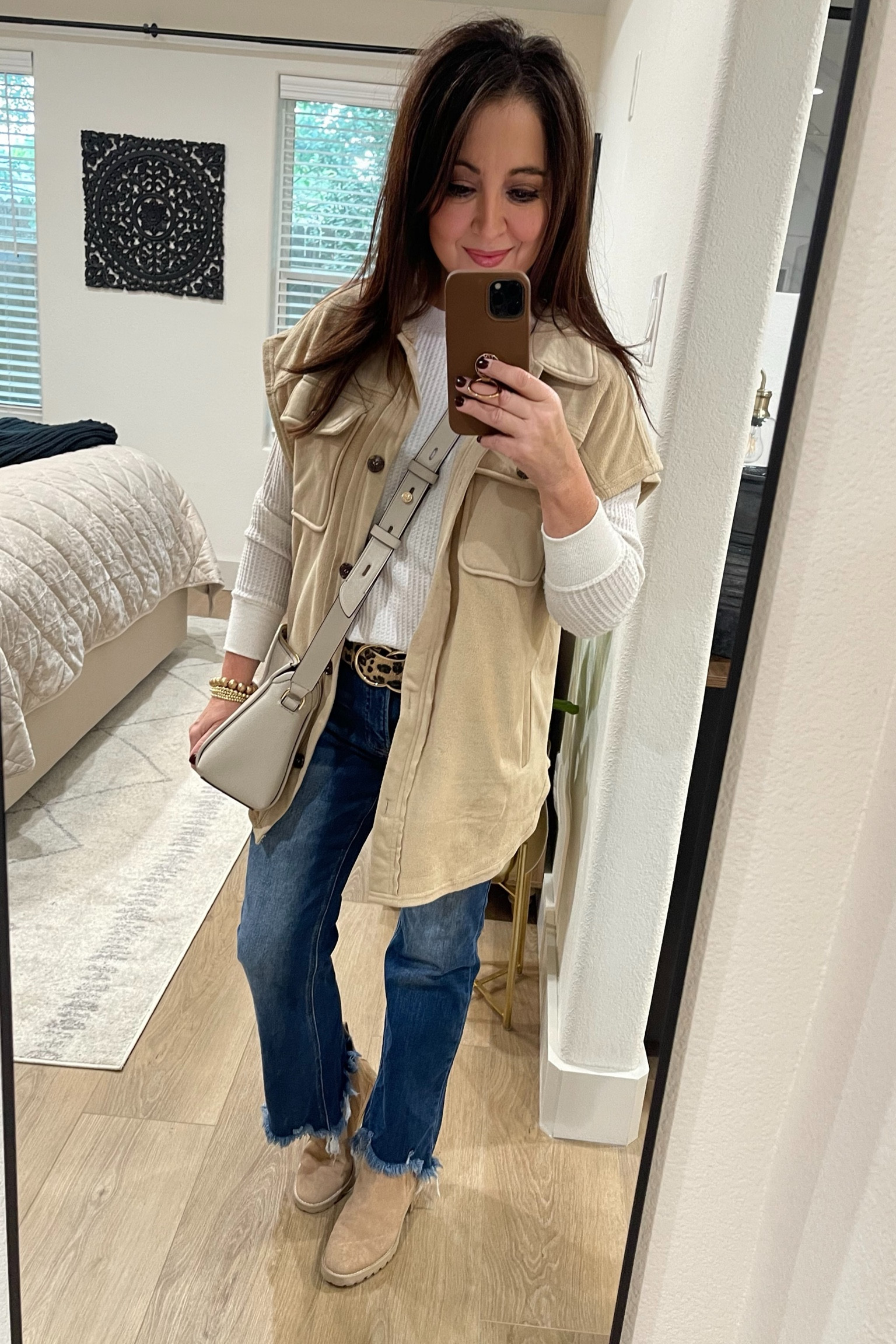 I bought this Sherpa vest last year but tagged similar styles. So easy to throw in over a basic tee and have a cute casual outfit & it comfortable for a busy day!