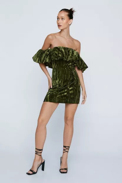 Petite Velvet Frill Bardot Mini Dress