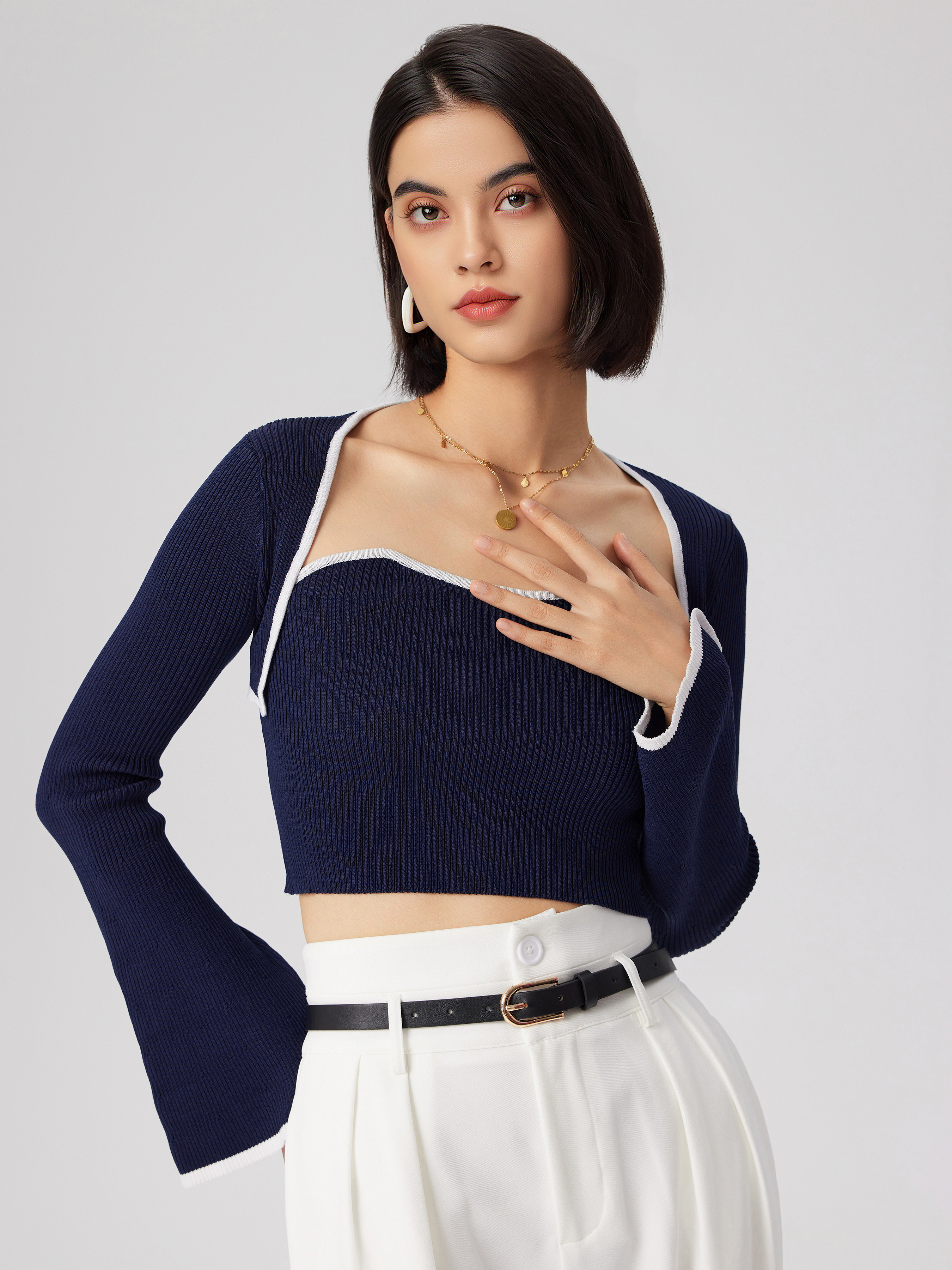 Knit Fabric Knit Contrasting Binding Crop Tube Top & Bell Sleeve Shrug For Daily Casual