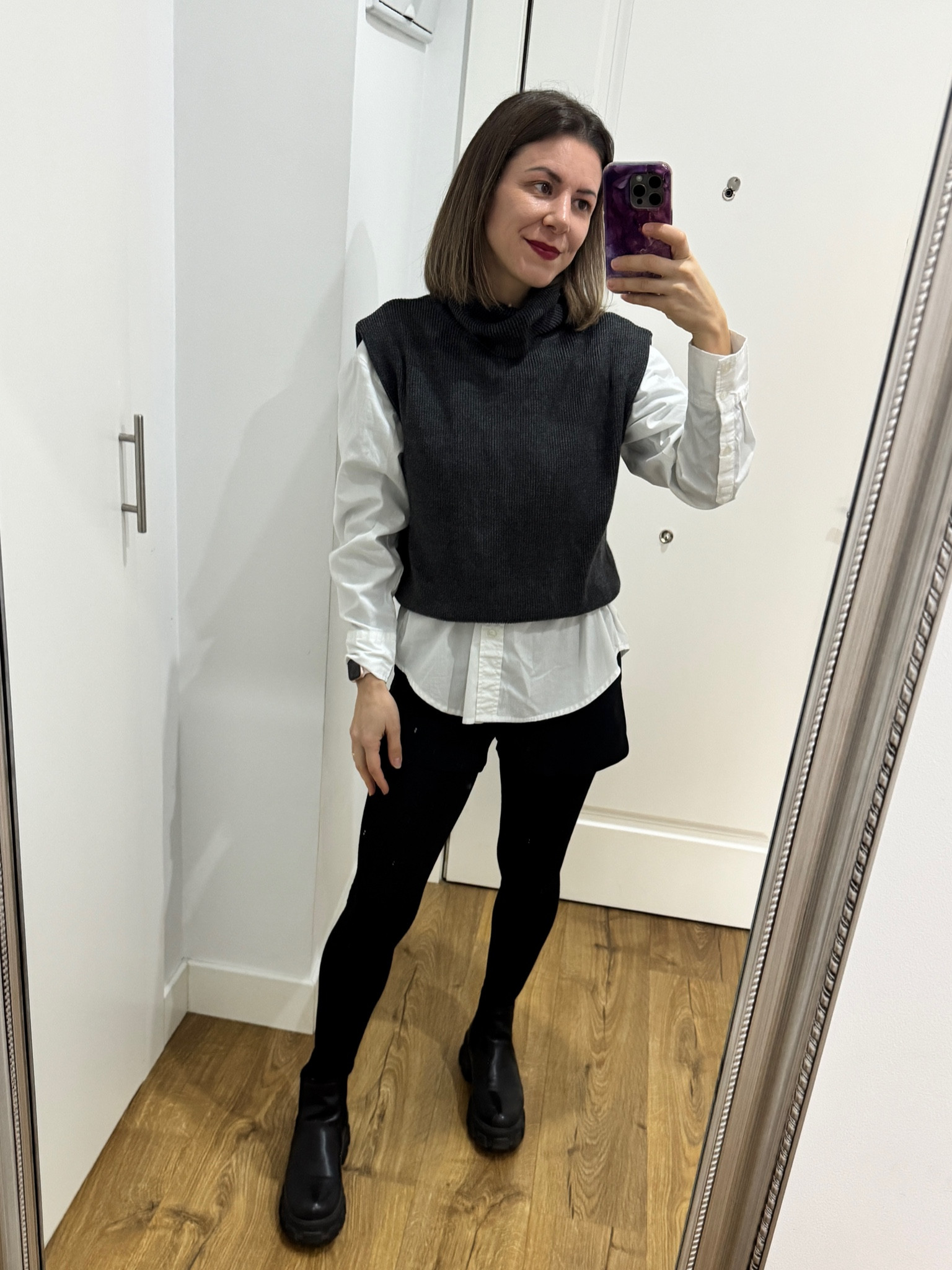 Playing with shirt and sweater vest for an almost all black outfit!