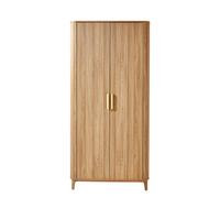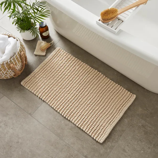 Neutral bedroom, ensuite, boucle bed, gingham cushions, green lamp, very wardrobes, large rug