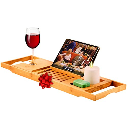 Amazon.com: Premium Bamboo Bathtub Tray Caddy - Expandable Wooden Bath Tray - Adjustable Tray for...