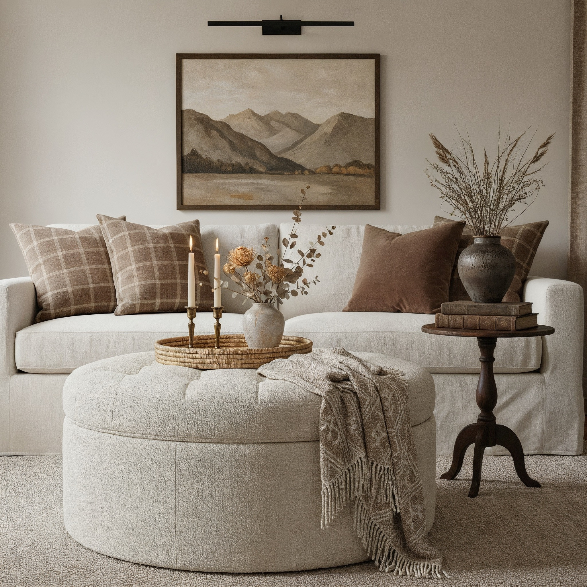 Keywords: modern living room, organic modern, neutral home decor, cozy sofa, brown velvet couch, minimalist coffee table, textured throw pillows, black window frames, beige curtains, earthy neutral palette, home styling ideas, living room inspiration, modern interior design, warm neutral decor, cozy aesthetic