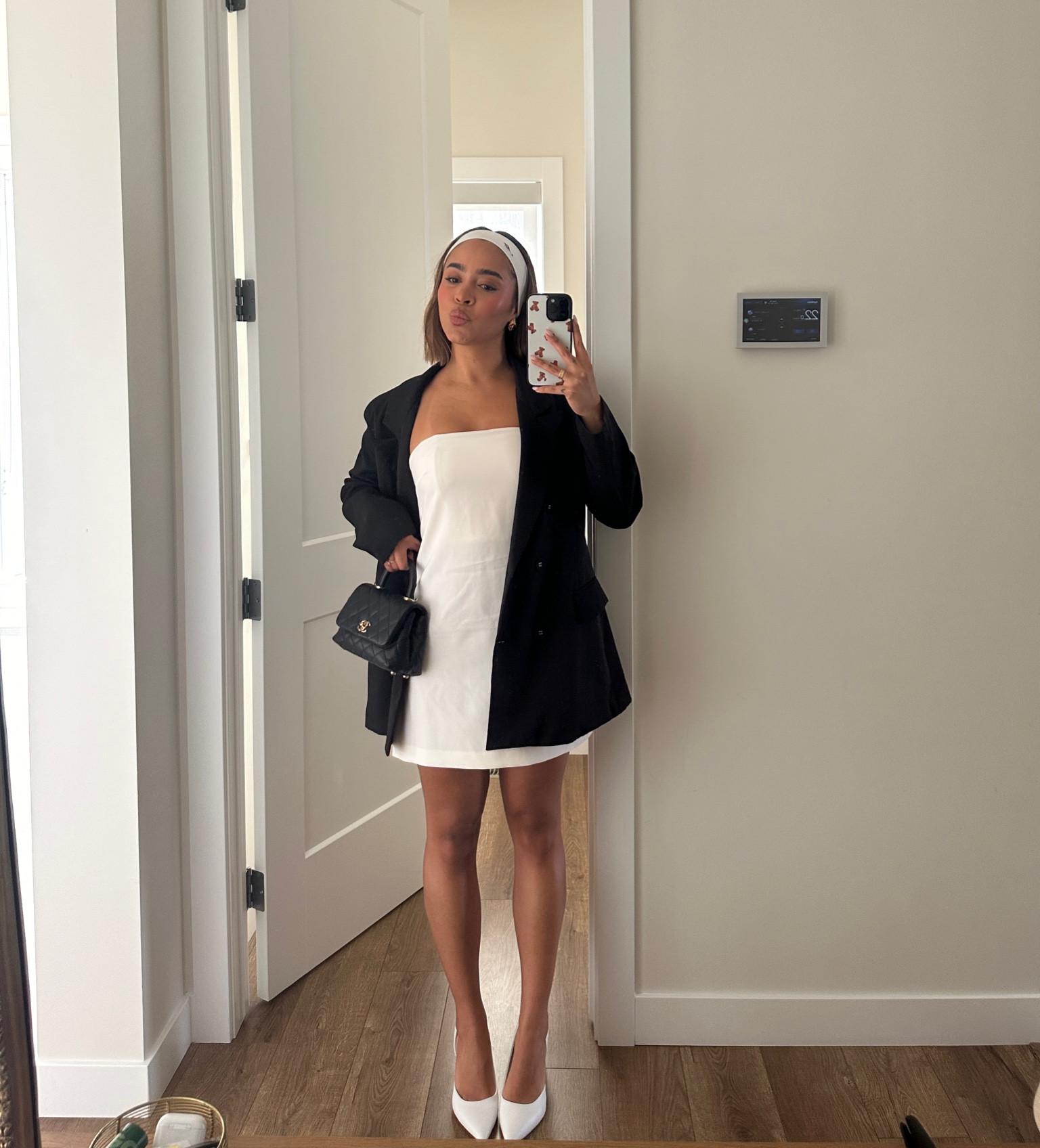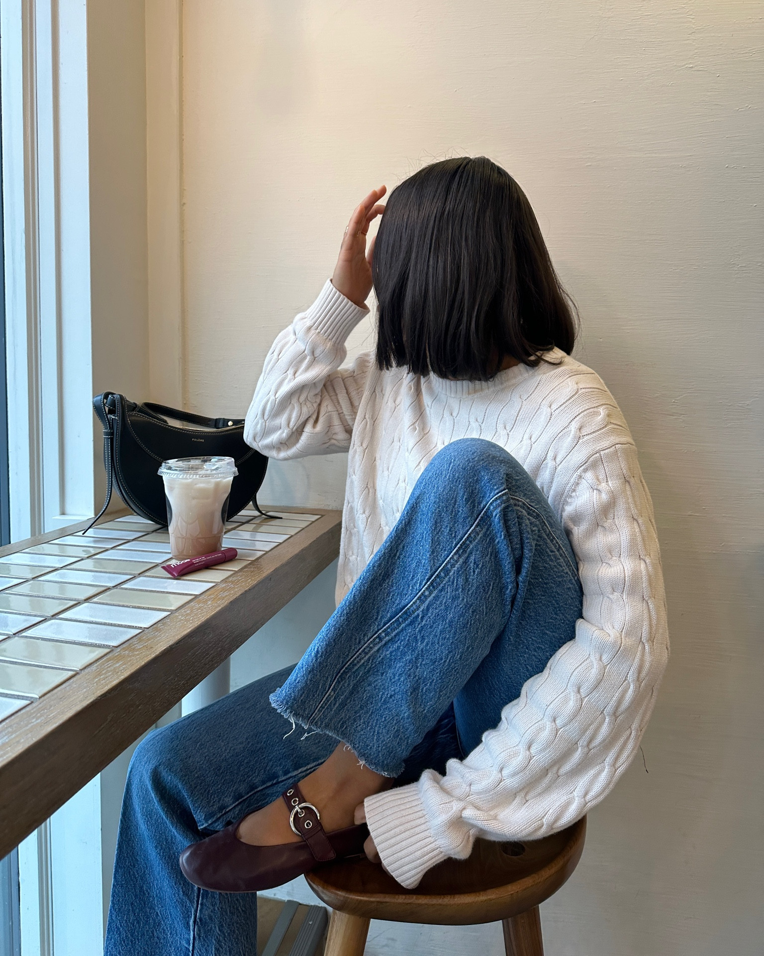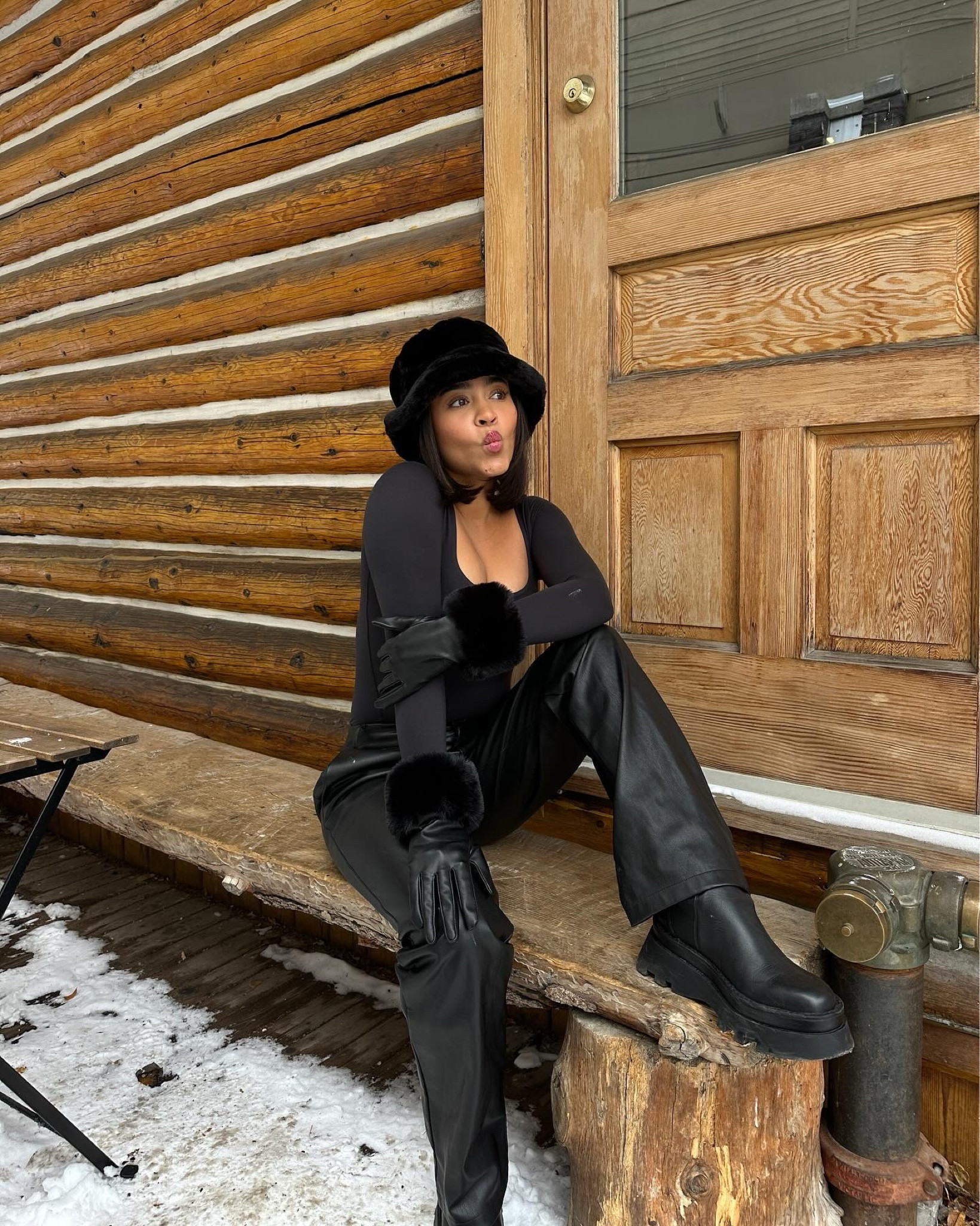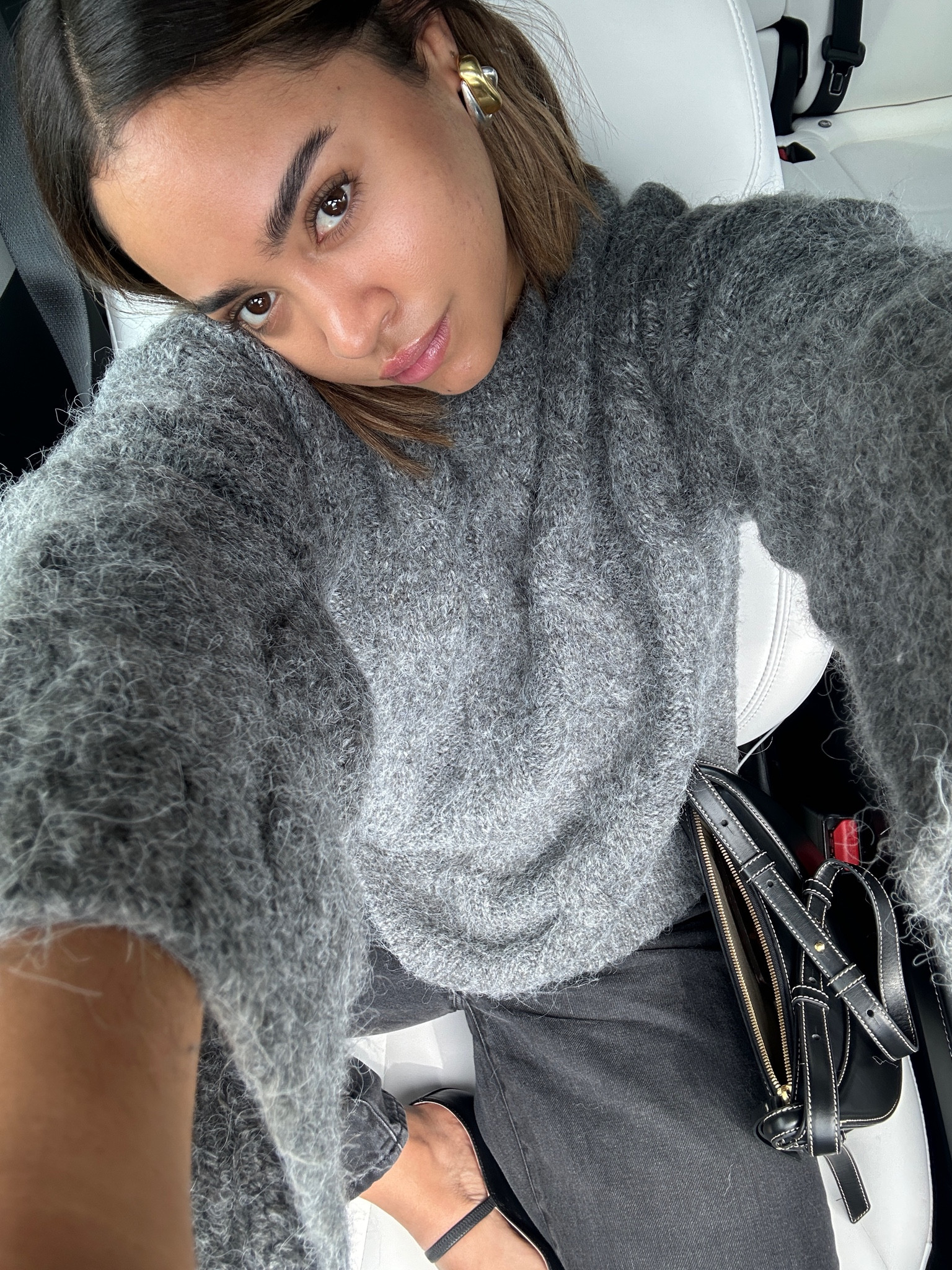 nyc preppy outfit | school girl brown skirt, beige cashmere sweater, brown oversized faux leather jacket , vintage louis vuitton bag and black loafers #LTKFind #LTKtravel #LTKfit