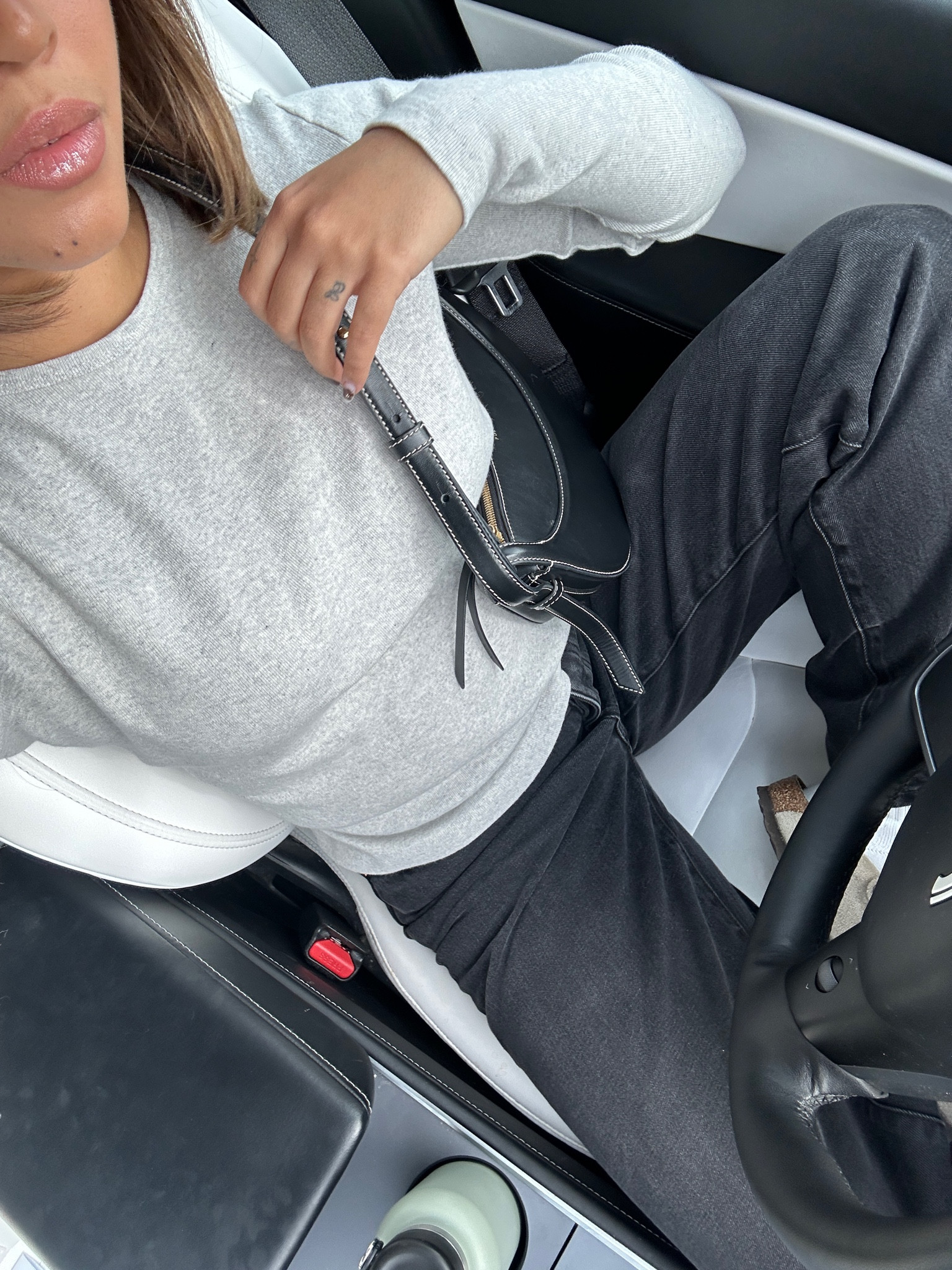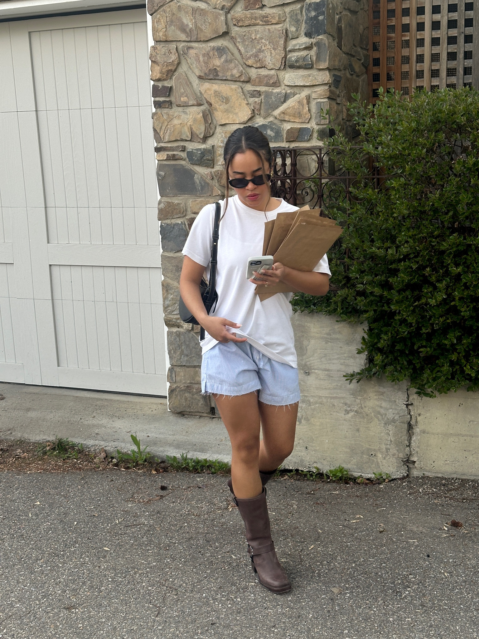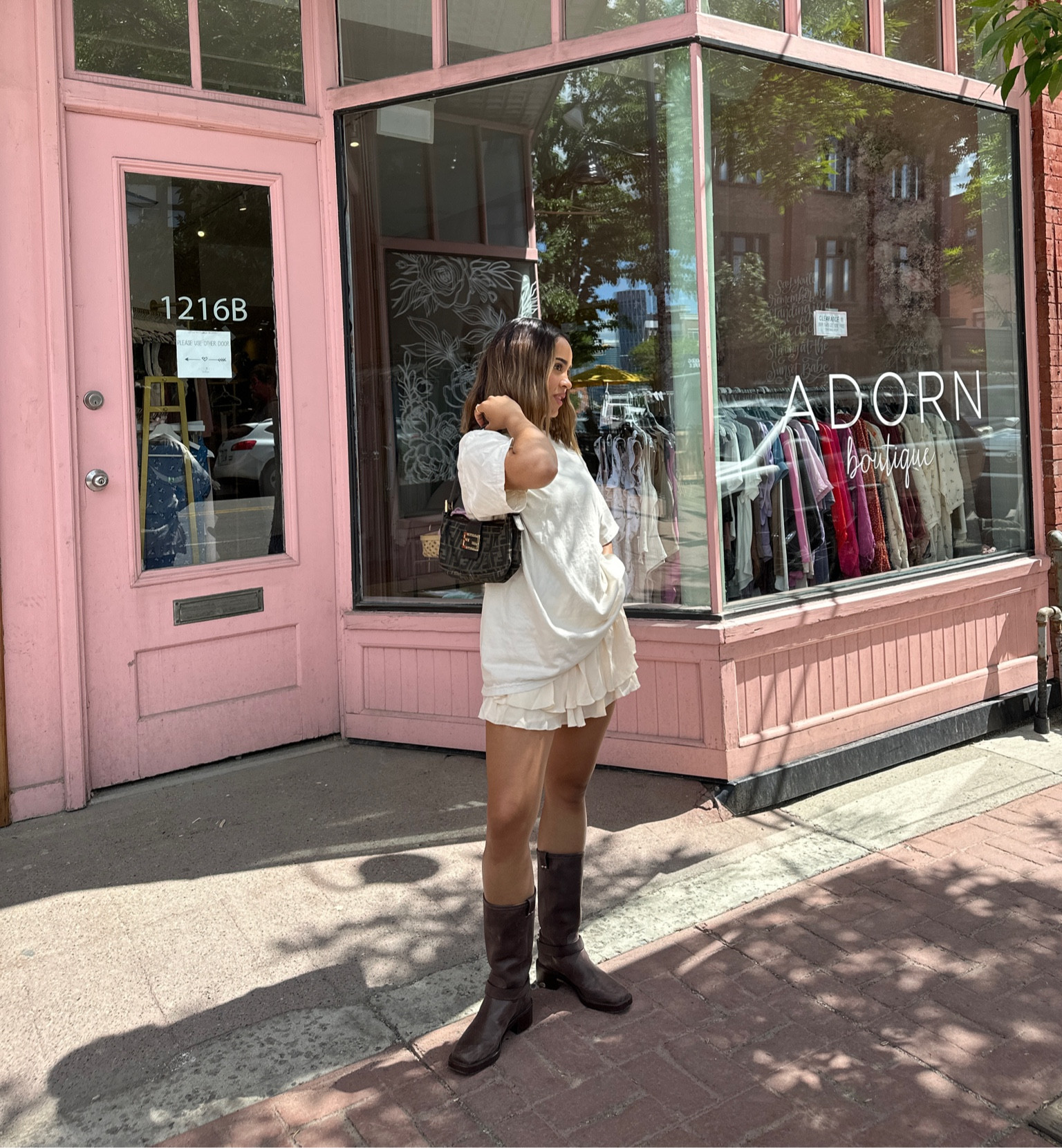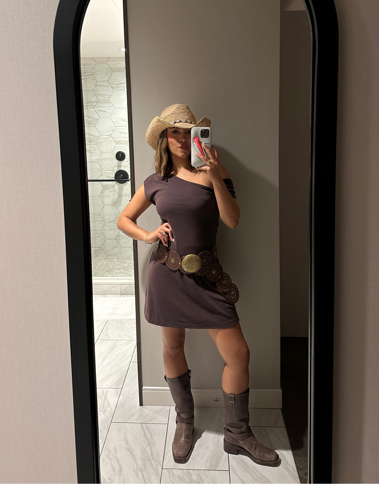 nyc preppy outfit | school girl brown skirt, beige cashmere sweater, brown oversized faux leather jacket , vintage louis vuitton bag and black loafers #LTKFind #LTKtravel #LTKfit