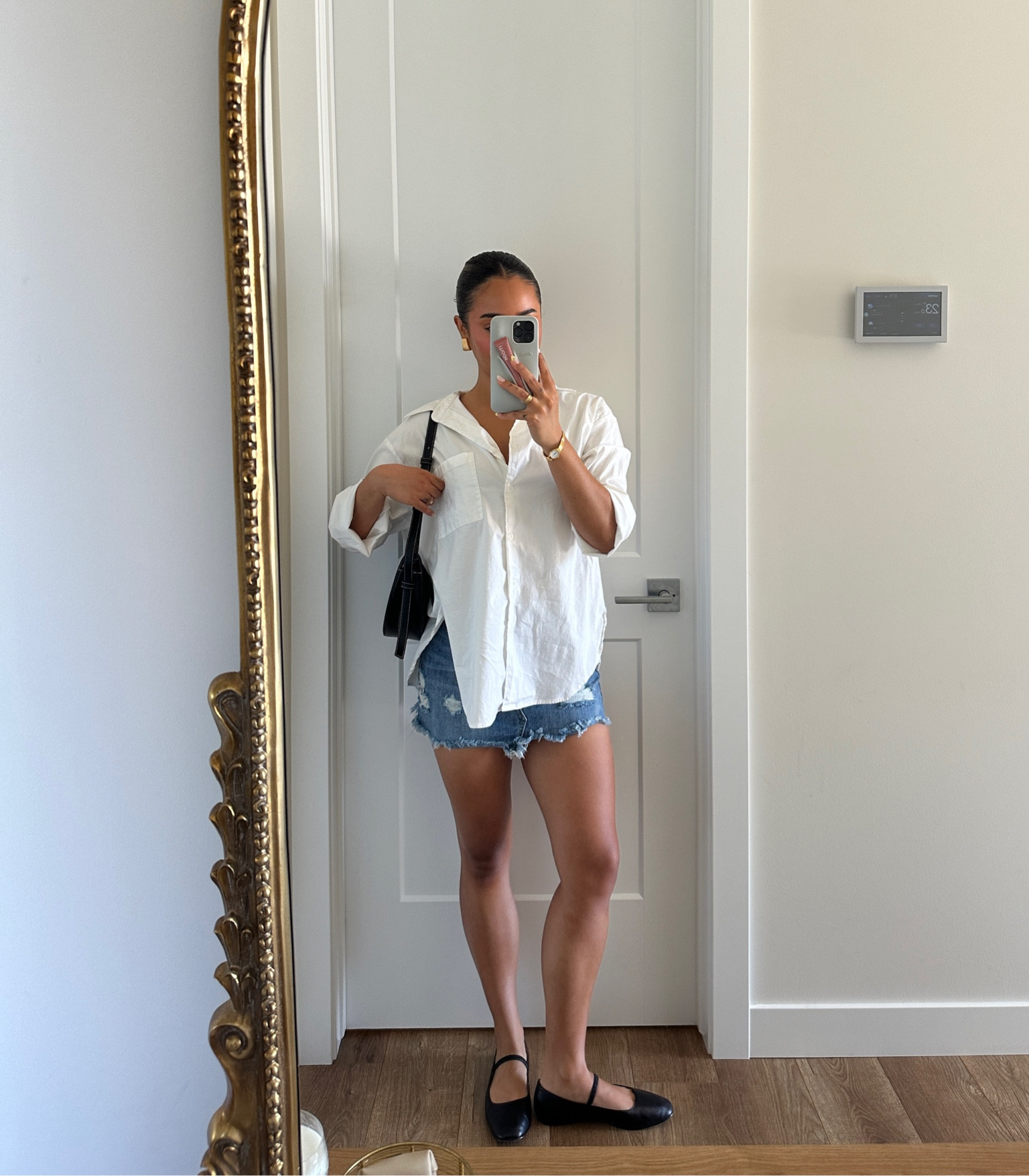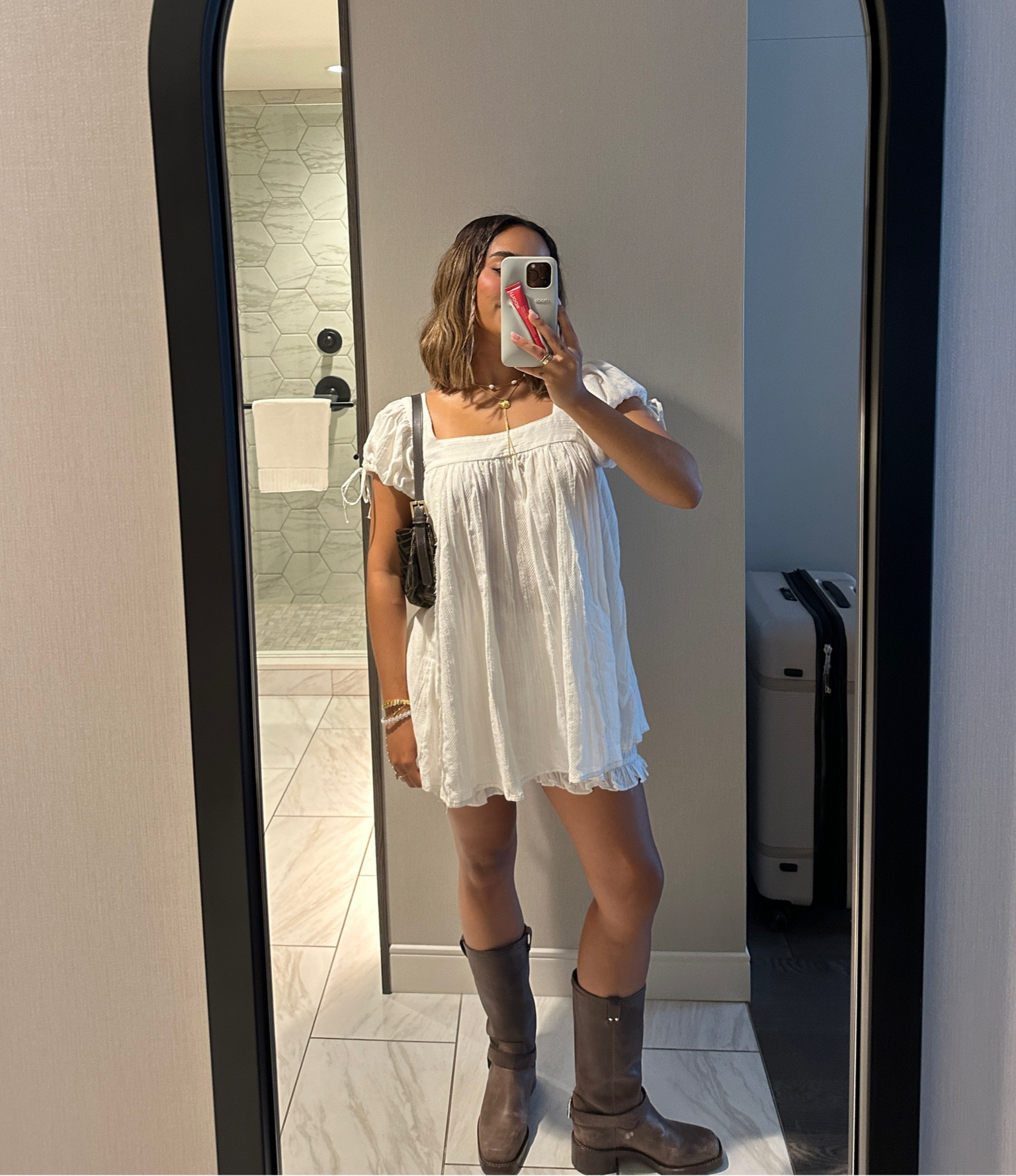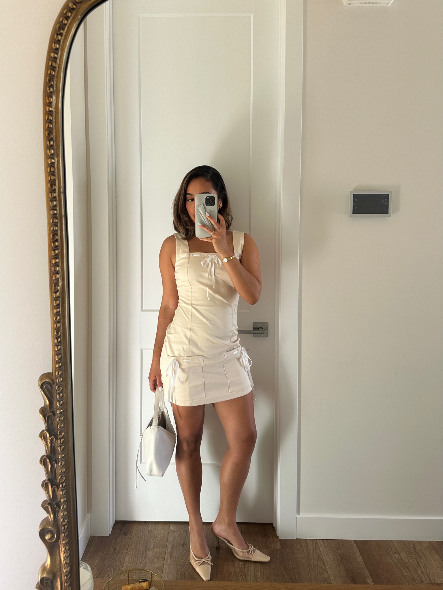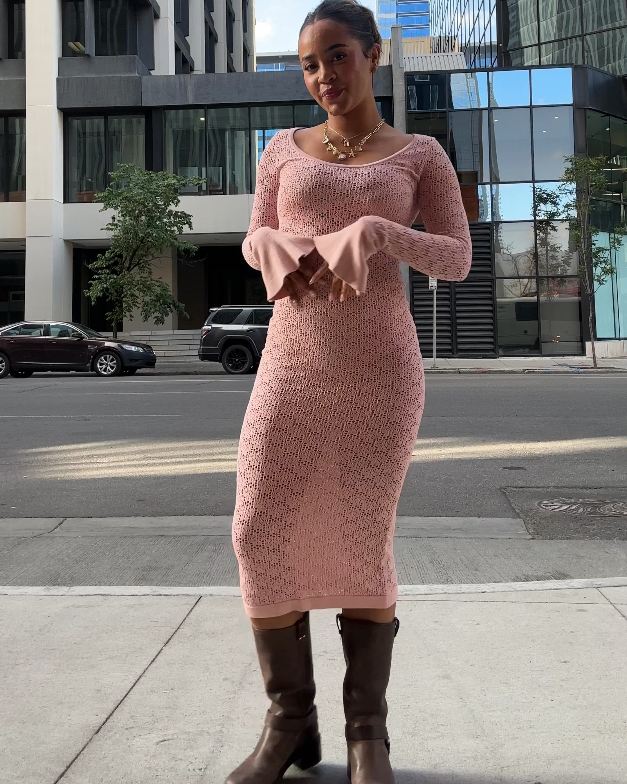 nyc preppy outfit | school girl brown skirt, beige cashmere sweater, brown oversized faux leather jacket , vintage louis vuitton bag and black loafers #LTKFind #LTKtravel #LTKfit