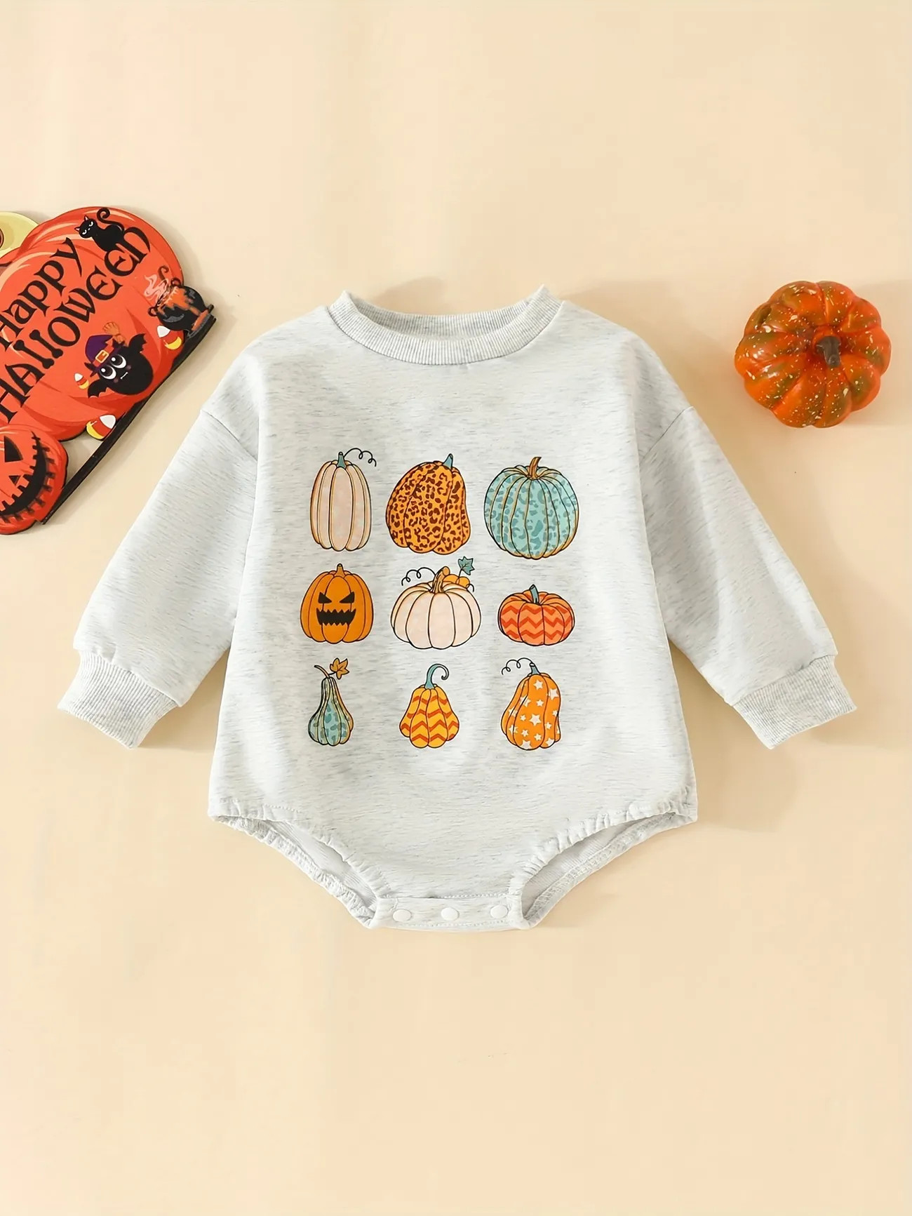 Lovely Baby Pumpkin Print Romper, Buckle Pullover Triangle Jumpsuit, Perfect For 0-2 Years Old Ba...