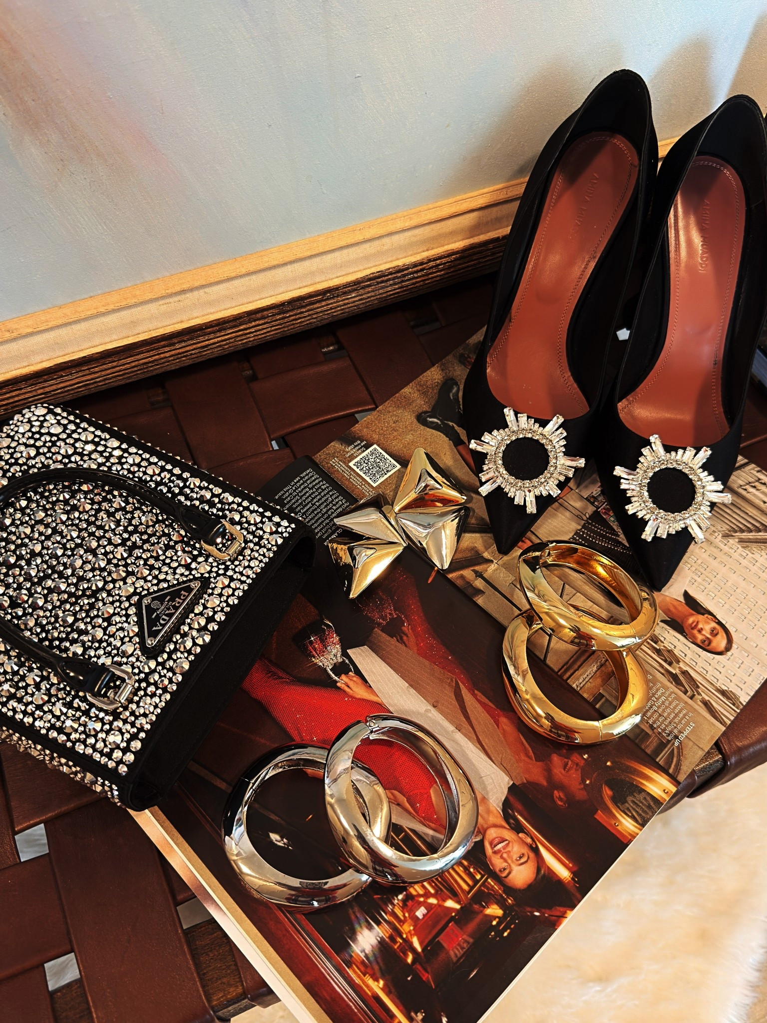 Black tuxedo blazers, red tight, black slingback, red Prada bag