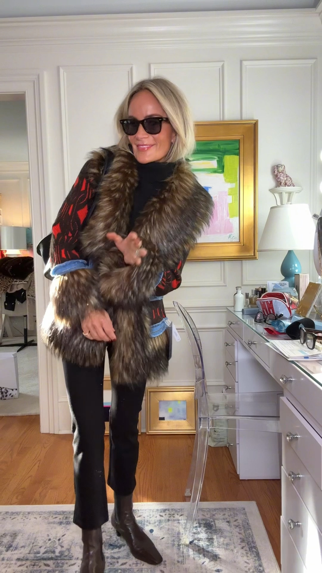 This is my go to elevated black outfit when I want to look expensive and put together without overthinking it. A fitted black turtleneck paired with tailored black pants is such a timeless base, then adding a statement jacket instantly makes the look feel fashion forward and intentional. Finished with sleek ankle boots, a structured black tote, and bold gold hoop earrings for that polished chic vibe. This outfit works perfectly for fall and winter dinners, events, travel days, or anytime you want a classic outfit that still feels modern and stylish.