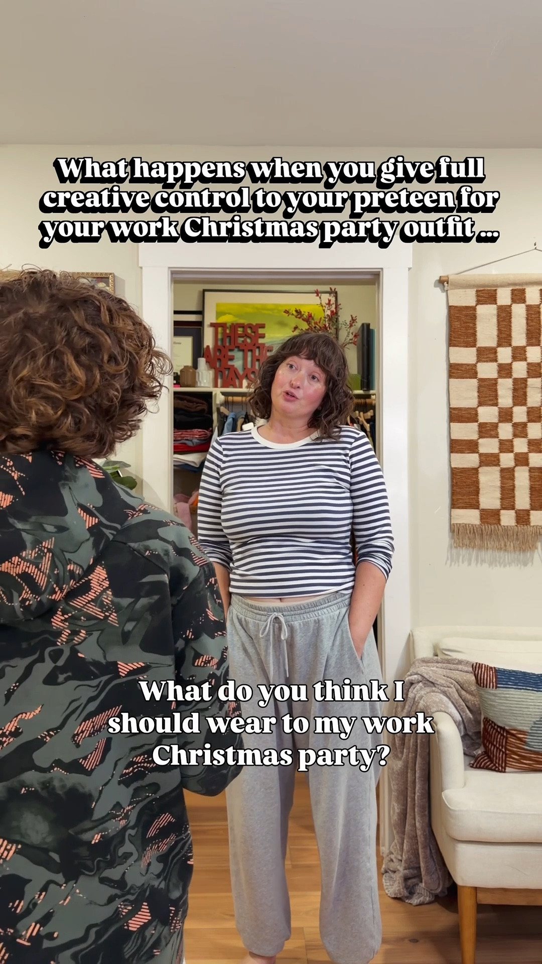 Round 2 of “let my kids pick my Christmas party outfit ”… and today my 9-year-old took FULL creative control!