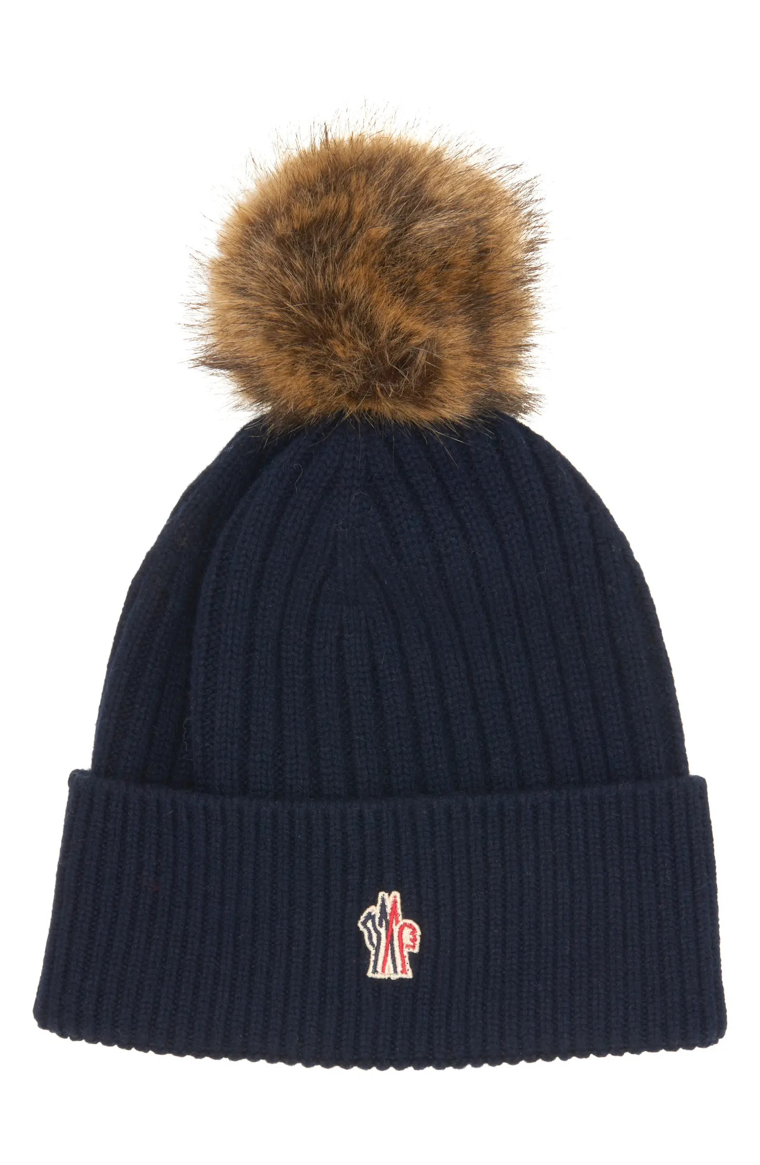 Cashmere & Wool Rib Beanie with Faux Fur Pompom