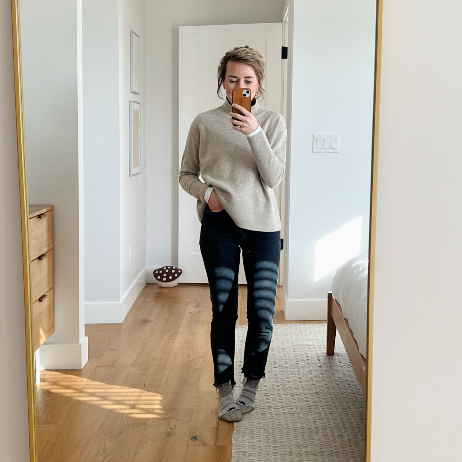 Sweater is several years old from Everlane and no longer sold, but I believe it was called the Cashmere Boxy Turtleneck. Still a favorite