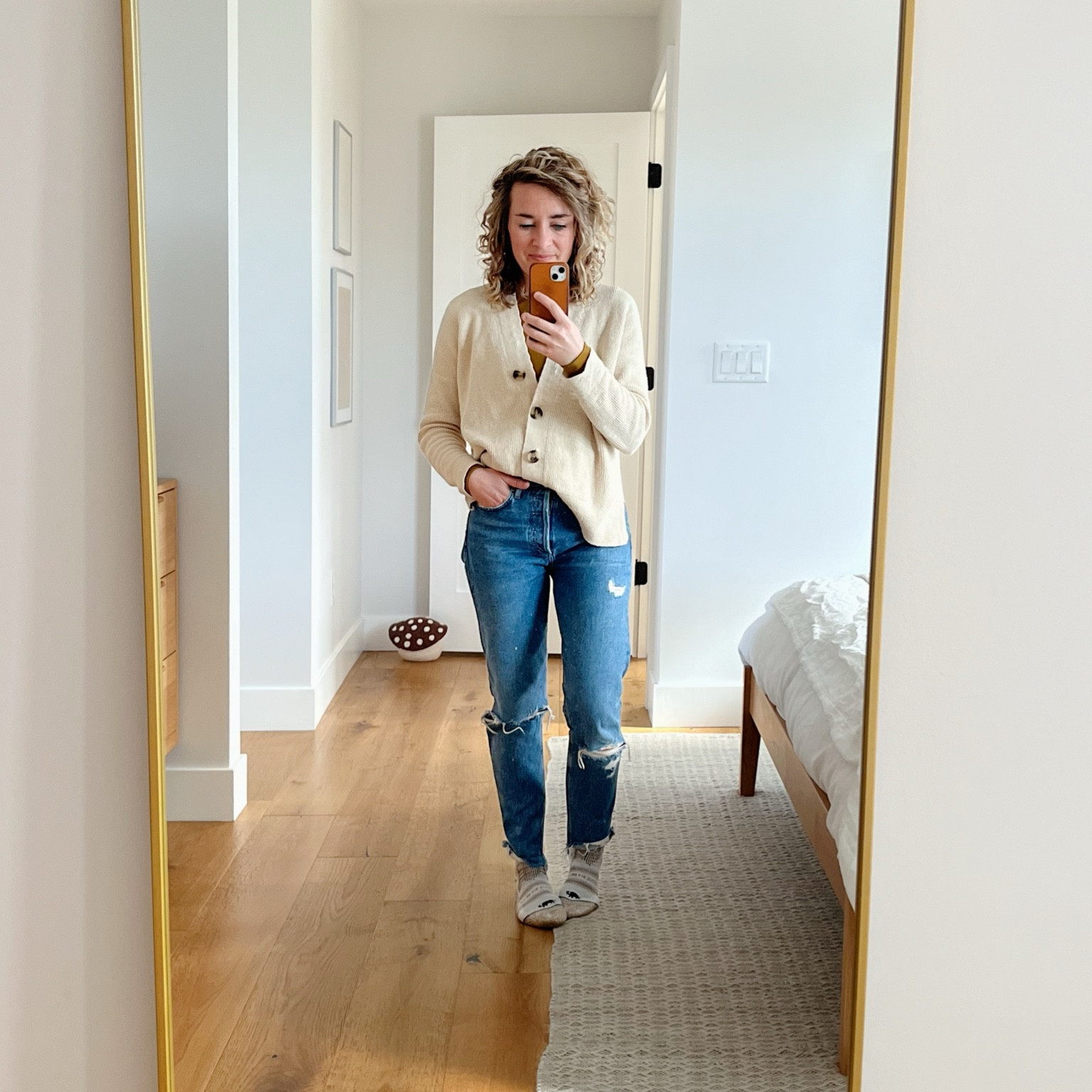 Bodysuit is really old from Everlane. Jeans are also Everlane but this exact color doesn’t appear to be available anymore. I linked the same style, though  Cardigan is the boyfriend style and is extremely warm