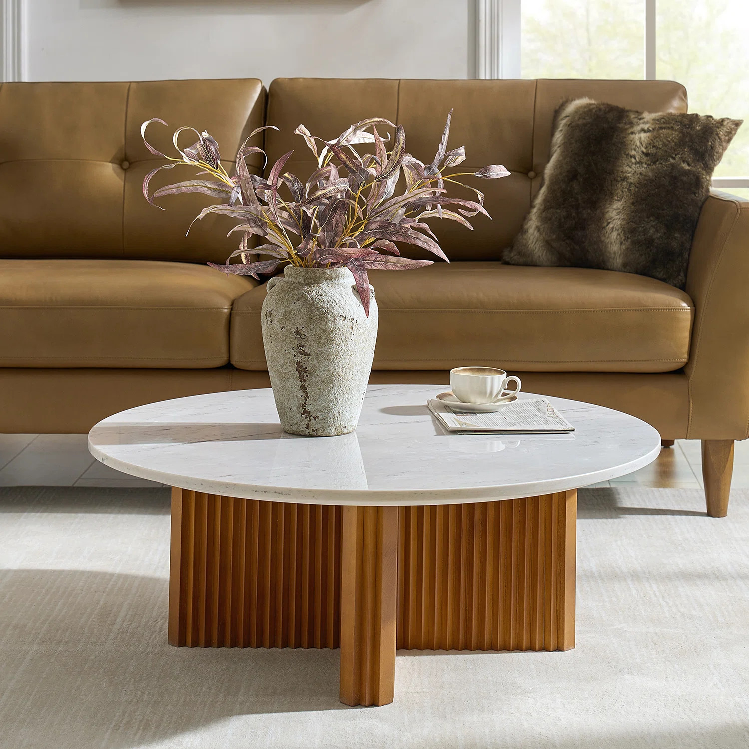 Orren Ellis Elena Marble Top Coffee Table with Solid Wood Fluted Base | Wayfair