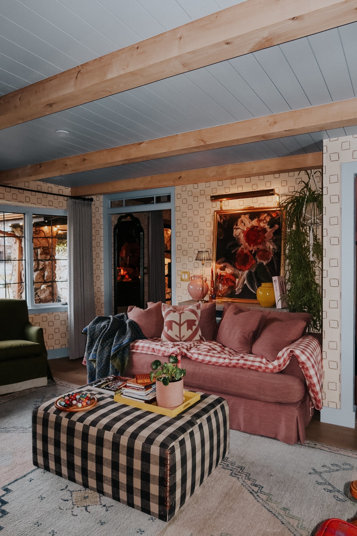 Family room update! Still thinking a window seat! What do you think? We could build one we could slide in and out. The sectional down to a sofa still felt big, and figured better to sell the sectional all together or use in a makeover. We got this smaller sofa that fits the room much better! Comment SOURCE for links to this room.