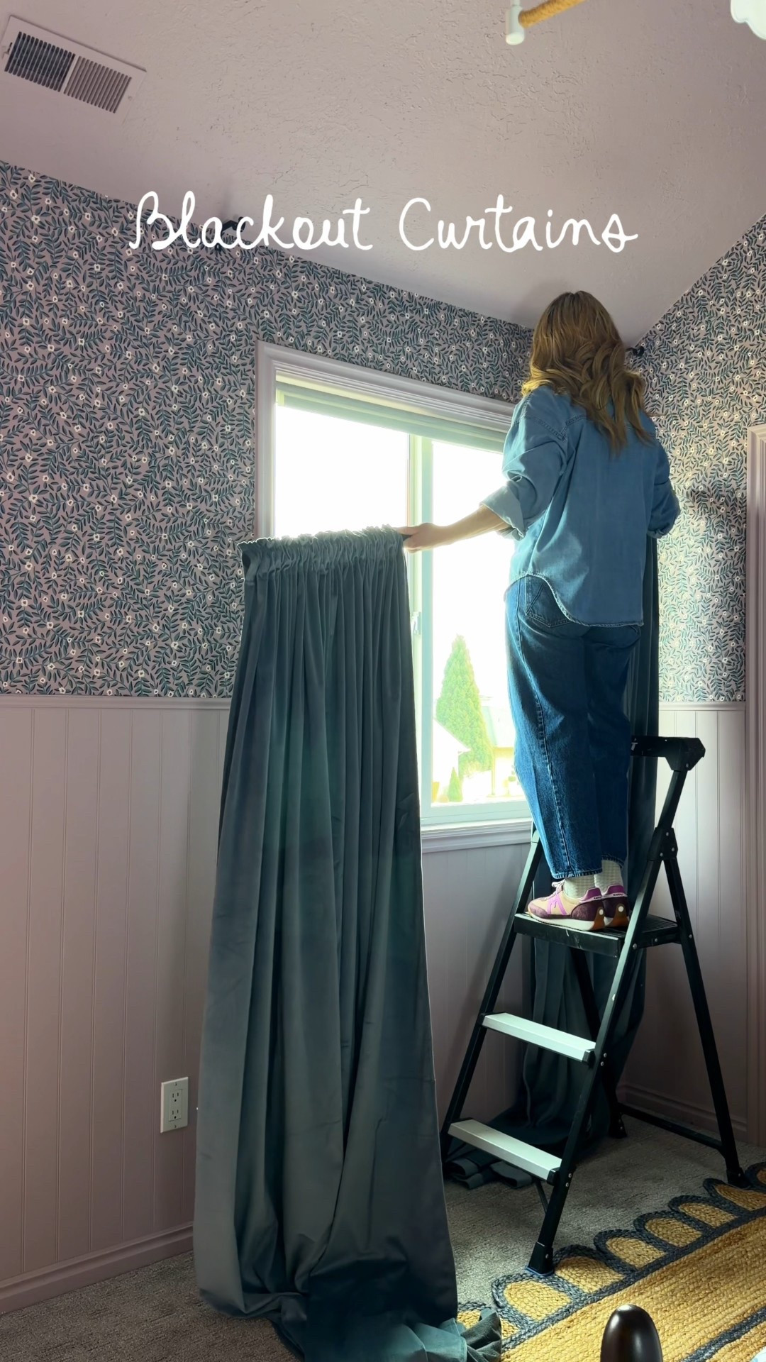 Wait for the shower curtain!!! Yes, totally a fun layer even with glass doors! Adds coziness and some privacy. Blue walls (Dutch Tile Blue) with pops of red made this dark basement bathroom a fun place to visit ♥️