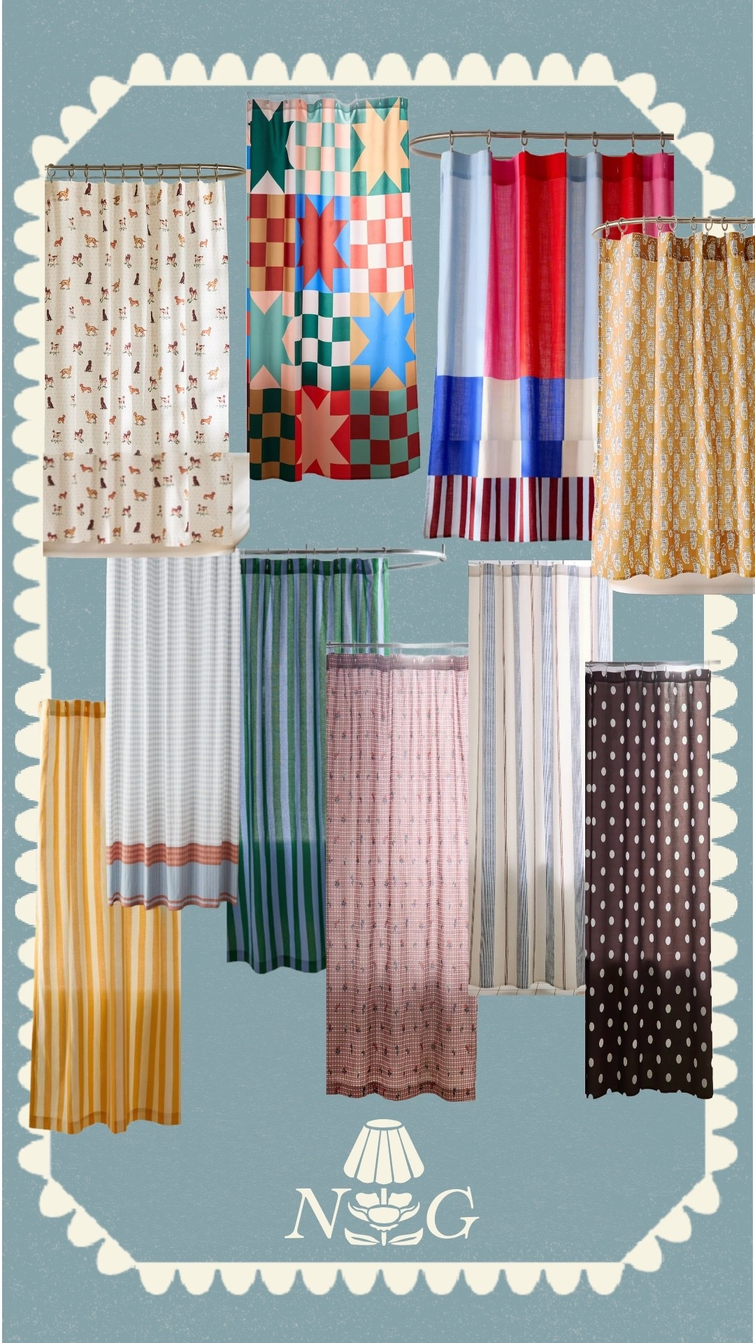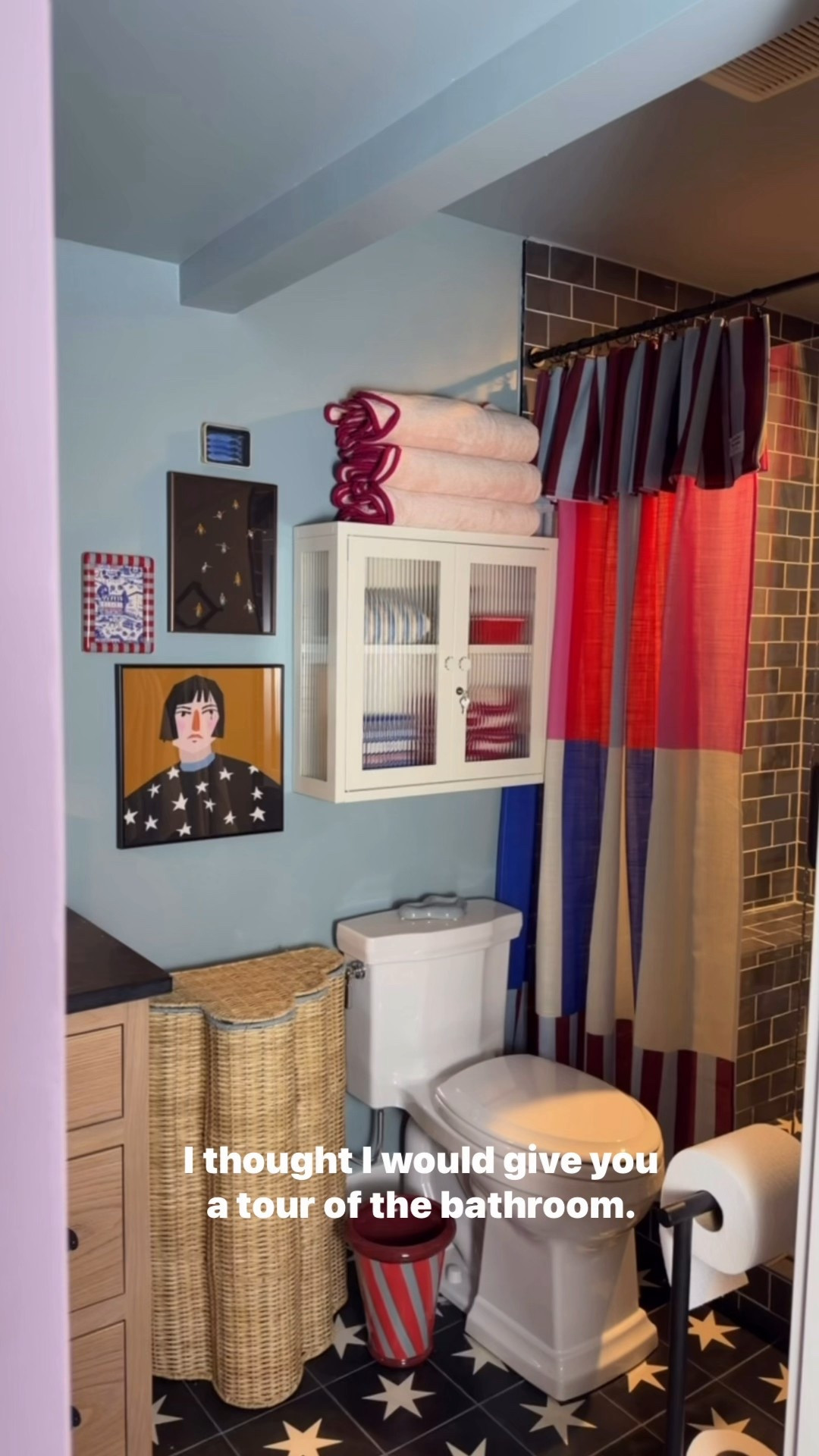 Wait for the shower curtain!!! Yes, totally a fun layer even with glass doors! Adds coziness and some privacy. Blue walls (Dutch Tile Blue) with pops of red made this dark basement bathroom a fun place to visit ♥️