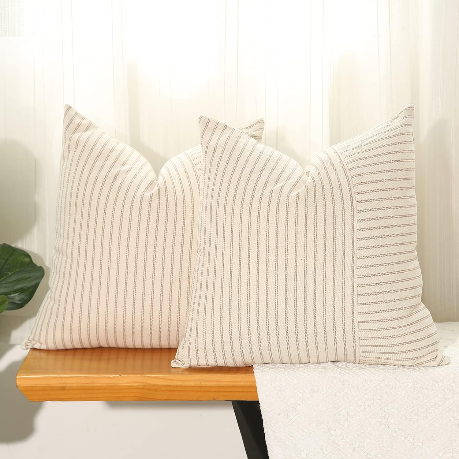 Hckot Khaki and Beige Patchwork Farmhouse Throw Pillow Covers 24 x 24 Inch, Pack of 2 Striped L...