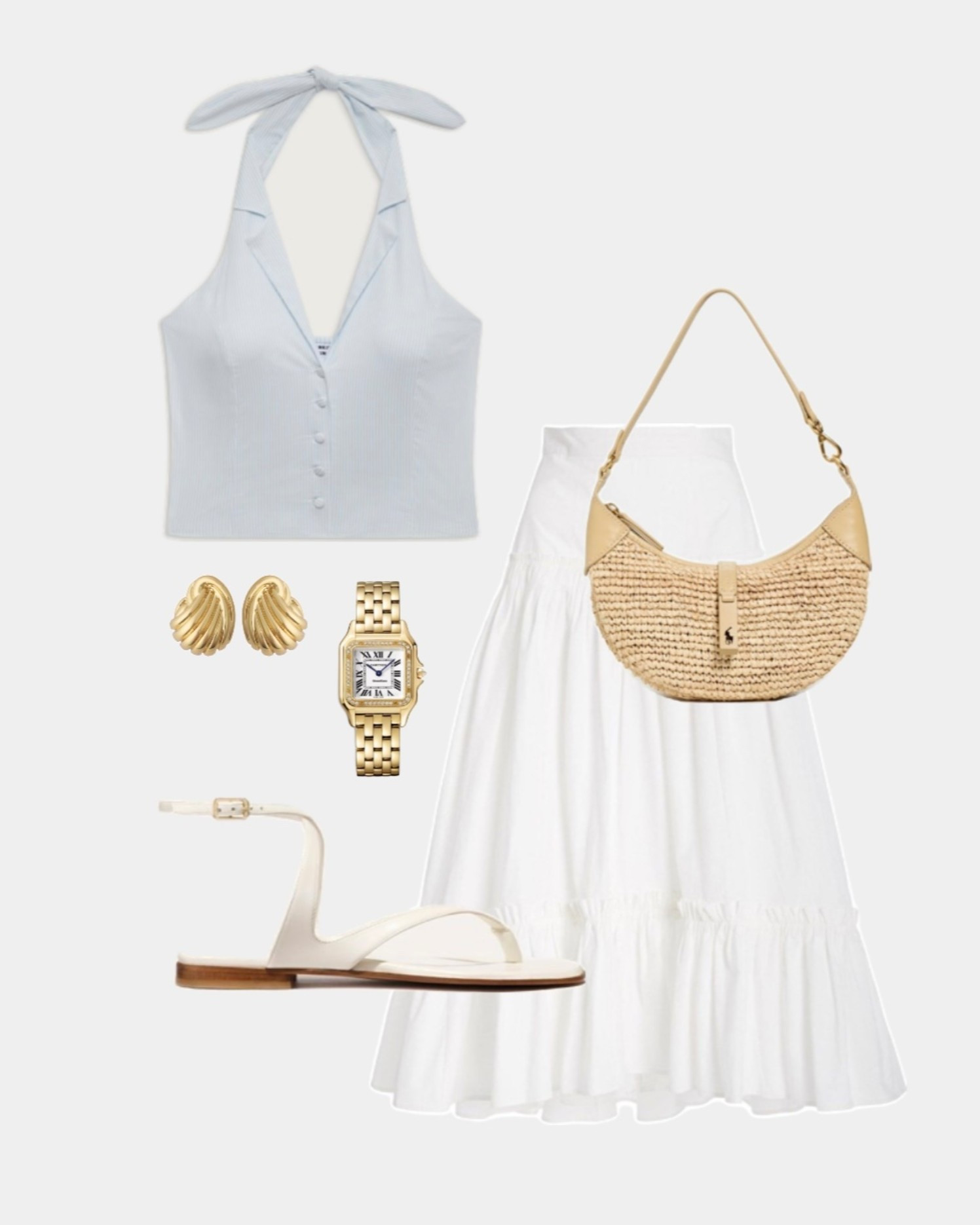 white two piece set, strapless white top, white maxi skirt, summer vacation outfit, European summer outfit, Amalfi Coast style, coastal chic outfit, blue statement bag, blue designer sandals, resort wear women, yacht outfit idea, classy summer look, elevated neutral outfit, vacation dinner outfit, luxury inspired summer style
