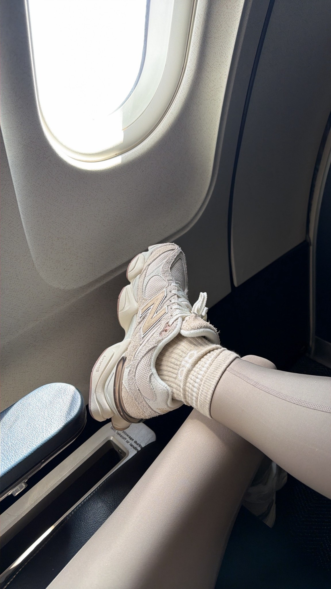 Monochromatic look, travel outfit, airport outfit, neutral luggage set, alo, beis, new balance, gucci